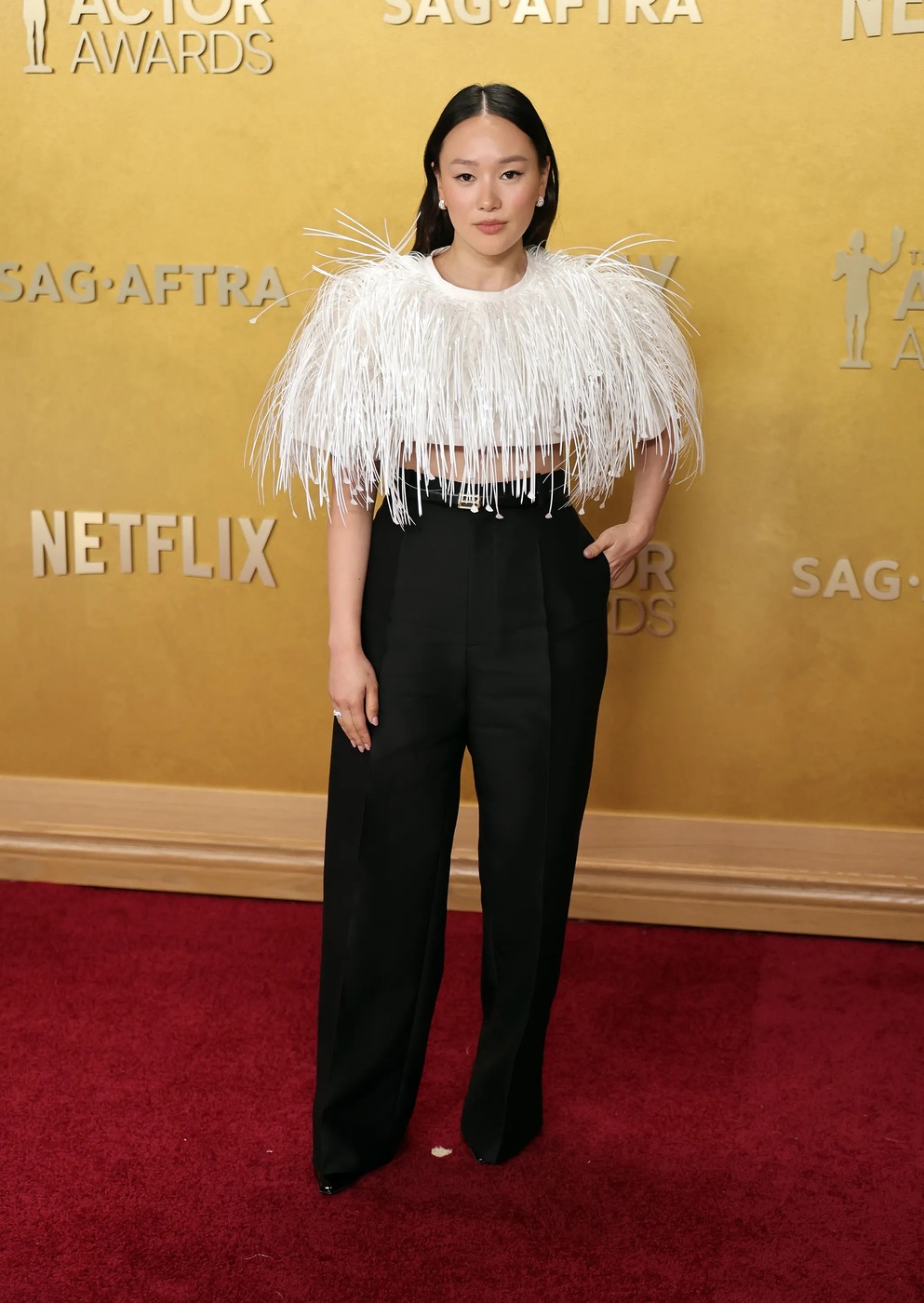 레드 드레스도 눈에 띄었습니다. 다니엘 데드와일러(Danielle Deadwyler)는 루이 비통의 지오메트릭 드레스를, 안나 사와이(Anna Sawai)는 보석으로 장식한 구조적인 아르마니 프리베를 선택했습니다. 물론 요즘 레드 카펫에서 빼놓을 수 없는 빈티지 패션도 볼 수 있었죠. 지방시는 아카이브를 열어 신시아 에리보에게 1997년 가을/겨울 꾸뛰르 실버 위브 라피아 드레스를 제공했습니다.