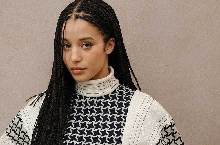 흰색 터틀넥 니트 원피스와 이그조틱 패턴 싸이하이 부츠는 와이/프로젝트(Y/Project), 검은색 언더웨어는 알 유 엠 아이(Are You Am I), 후프 귀고리는 대니조(Dannijo).