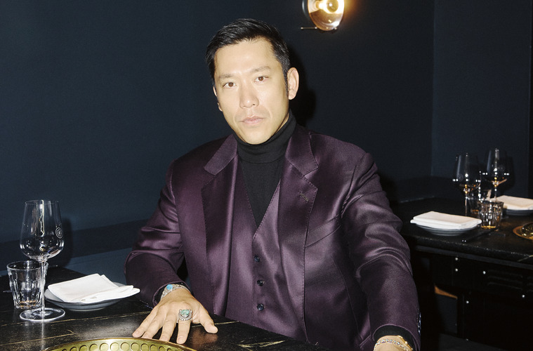 블랙 재킷과 팬츠, 로고가 들어간 머플러는 디올 옴므(Dior Homme).