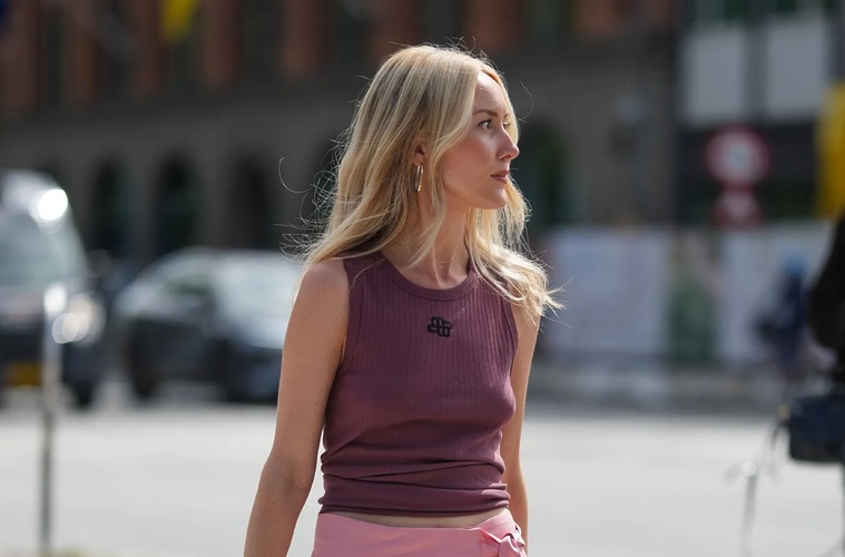 보라색 오버사이즈 재킷과 팬츠는 디앤티도트(D-Antidote), 광택감 있는 핑크 테일러드 재킷과 저지 니렝스 팬츠, 메탈릭한 그린 스트랩 샌들은 톰 포드(Tom Ford), 조개 모양 검정 플라스틱 귀고리는 발렌시아가(Balenciaga).