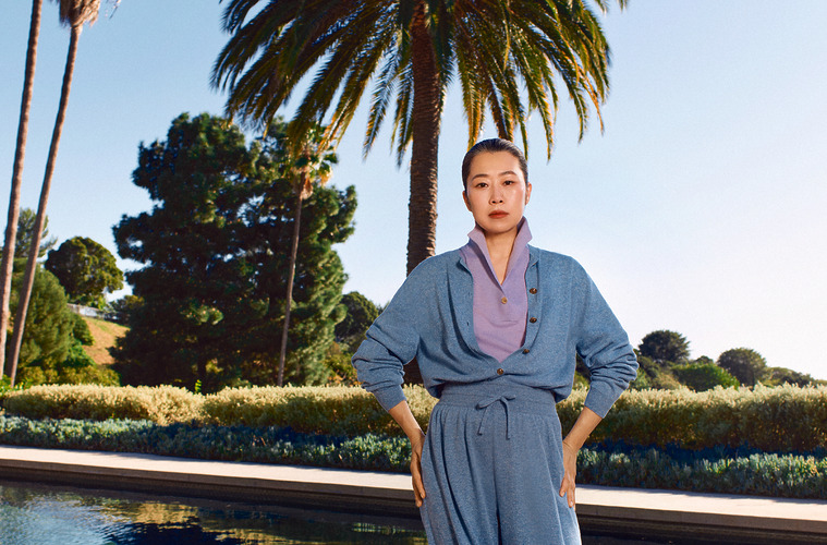 블루는 긍정적인 에너지를 준다. 아베 치토세의 하이브리드 버전으로 해석한 블루와 니트 스타일링. 주얼리와 니트 톱은 사카이(Sacai).