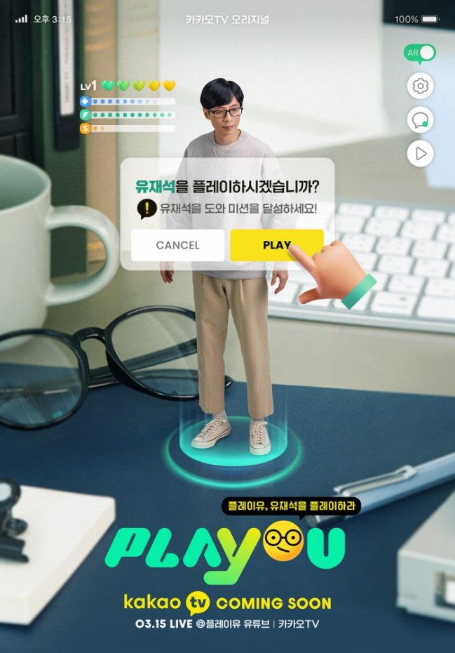 유재석의 또 다른 새 예능 프로그램은 카카오TV <플레이유>입니다. <플레이유>는 시청자들이 실시간 라이브를 통해 유재석을 ‘플레이’하는 신개념 인터랙티브 예능 프로그램입니다. 유재석은 시청자들이 라이브로 주는 미션을 수행해야 하는데요, 매주 다른 테마의 미션을 받아 현실 속의 ‘맵’ 안에서 다양한 방법과 수단으로 제한 시간 내에 목표를 달성해야 합니다.