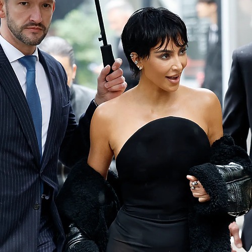 또 다른 찰떡궁합 아이템은 바로 블라우스와 블레이저입니다. 격식을 차리는 자리에 갈 때 유용하죠. 기모노 스타일의 매끈한 블라우스와 앨리게이터 백을 멘 킴 카다시안을 보세요.