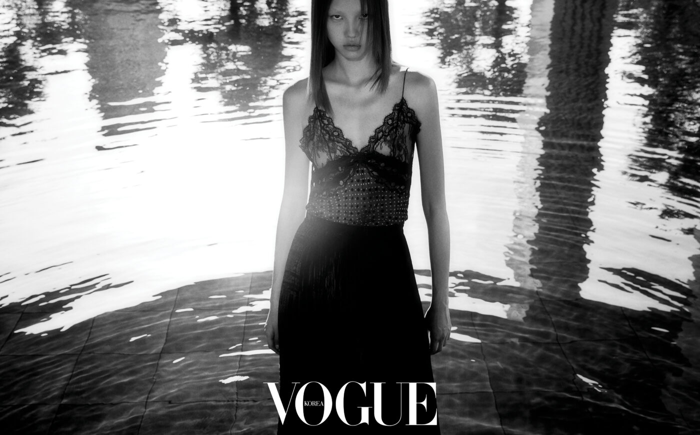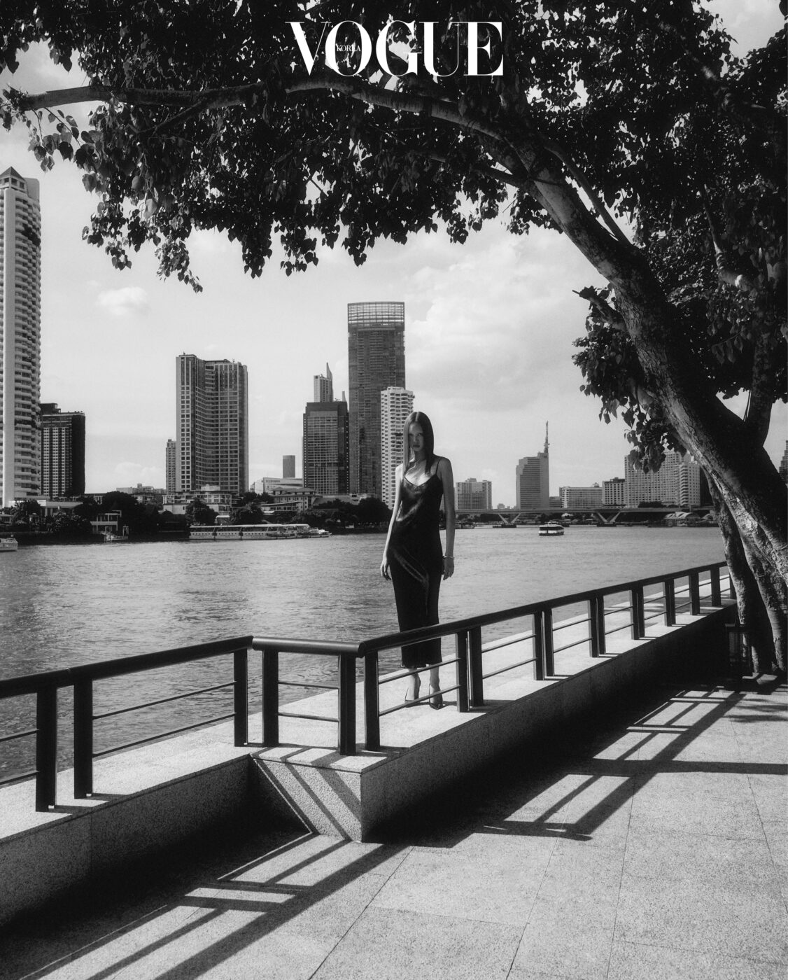 BY THE RIVER 방콕을 가로지르는 짜오프라야강에서 만난 잰. 특급 호텔과 리조트가 즐비한 강가에도 방콕 시민을 위한 공간이 자리한다. 미니멀한 블랙 실크 슬립 드레스가 시원한 풍경과 잘 어울린다.