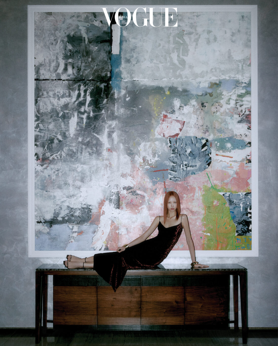 ART SHOW 태국 아티스트 타이위짓 쁭까셈솜분(Thaiwijit Puengkasemsomboon)의 작품 앞에 자리한 잰. 레오퍼드 패턴이 돋보이는 붉은색 슬립 드레스를 입었다.