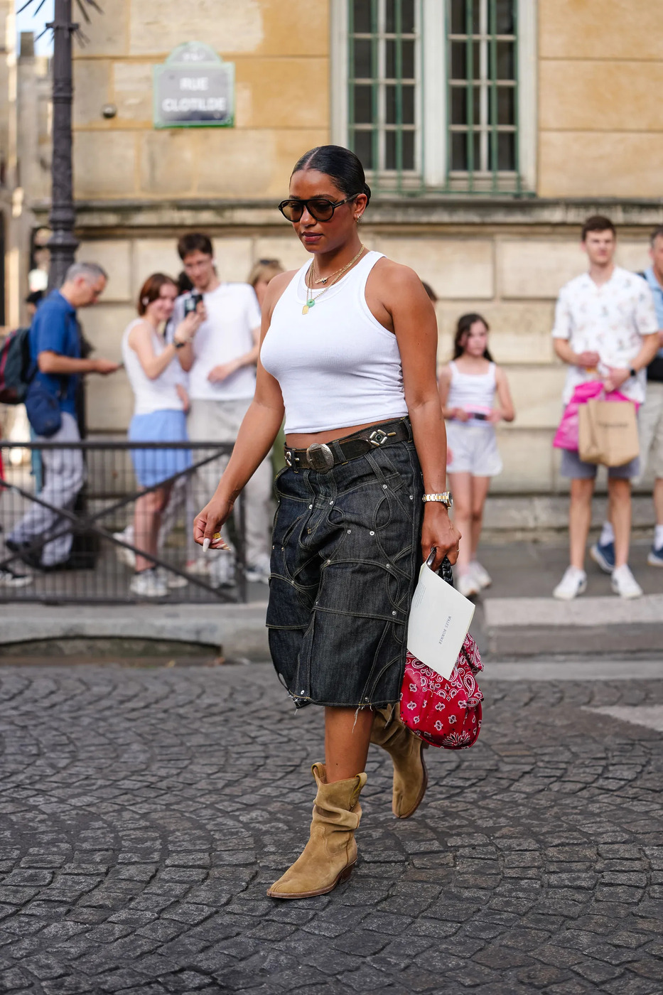 더 일상적으로 착용할 수 있는 옷차림을 원한다면 고민할 것 없이, 무지 탱크 톱에 푸른빛을 머금은 데님 버뮤다 팬츠를 입어주기만 하면 됩니다. 룩이 다소 단조로워 보일 수 있으니 신발로 재미를 줘야 하는데요. 가장 추천하는 것은 슬라우치 부츠나 카우보이 부츠입니다. 전체적으로 캐주얼한 분위기를 완성하는 만큼, 어울리지 않는 슈즈를 매치하며 ‘잘못된 신발 이론’을 따르는 거죠.