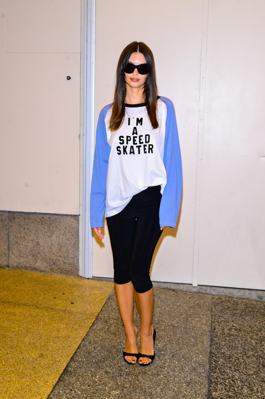 라이브 방송을 마친 후 잠깐 휴식이 필요했을까요? 에밀리는 멋스럽지만 불편한 수트를 벗어 던지고 캐주얼한 차림으로 카메라 앞에 나타났습니다. 위트 넘치는 슬로건이 적힌 래글런 슬리브 톱에 바이커 쇼츠를 매치했죠. 전체적인 분위기는 180도 달라졌지만, 바뀌지 않은 것이 하나 있었습니다. 바로 신발이죠. 지금 같은 믹스 매치의 시대에, 룩과 신발 무드를 통일하는 것에 집착하는 태도는 되레 쿨하지 못하다는 메시지를 던지려는 것 같았습니다.