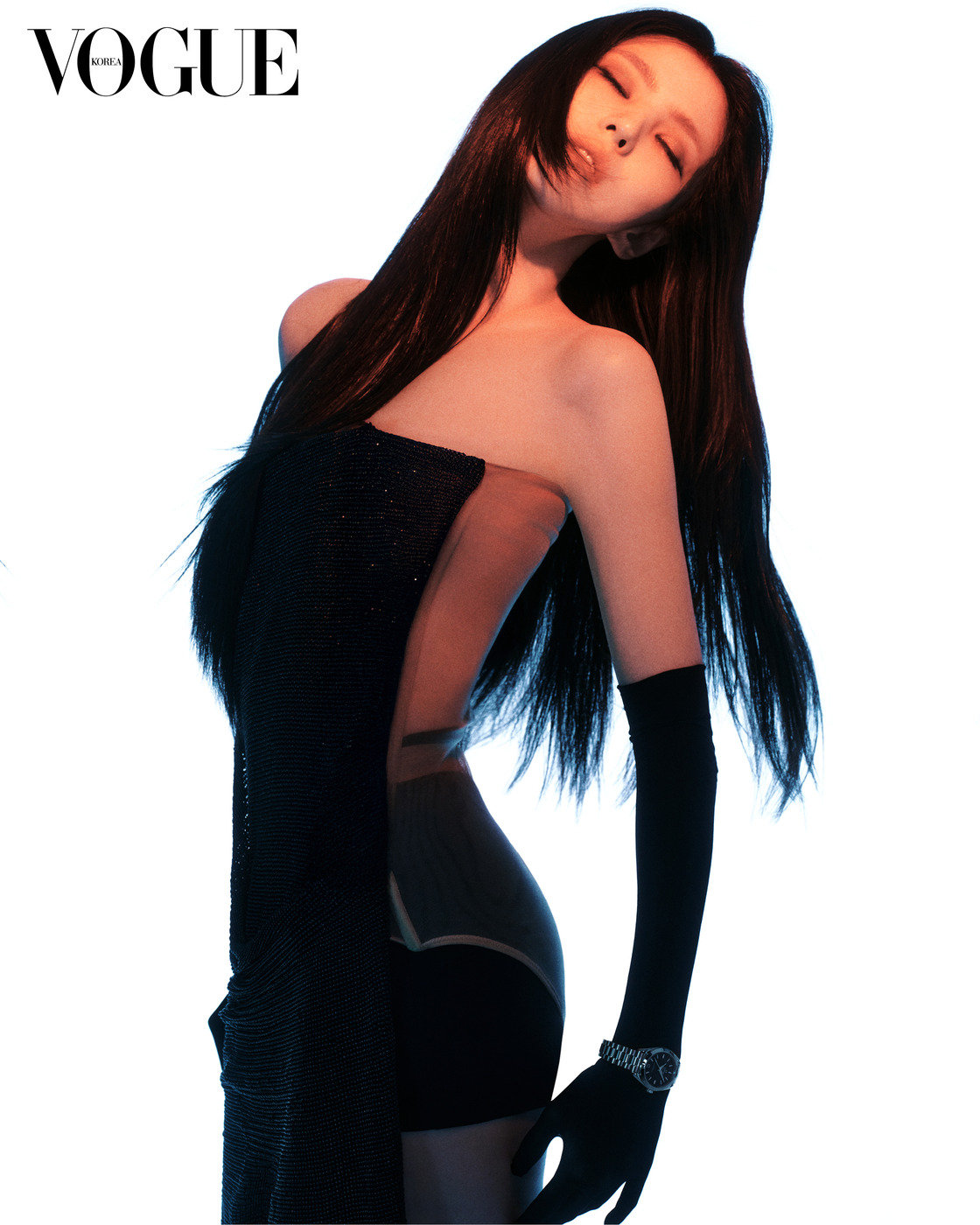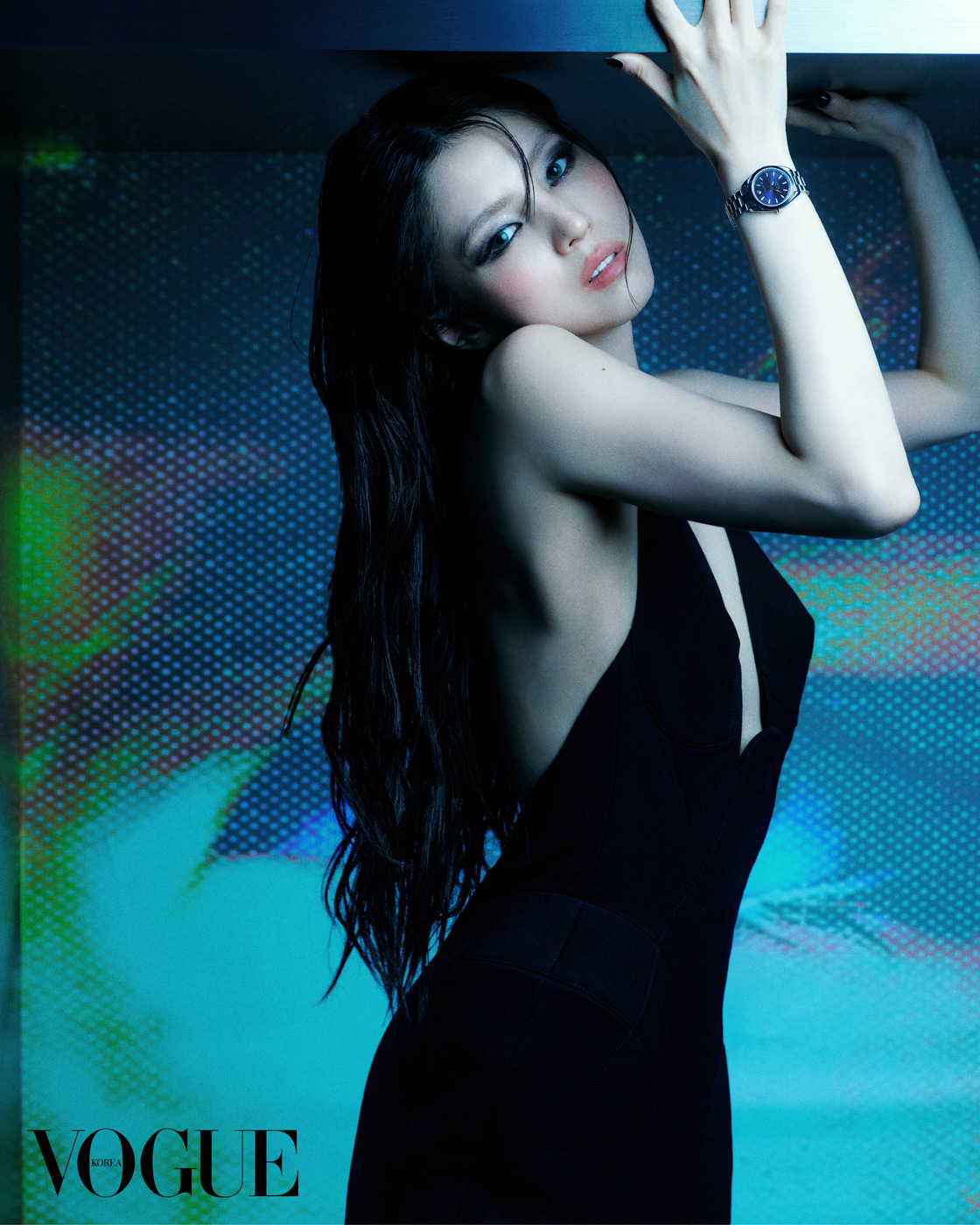 액션 영화의 한 장면처럼 유리로 된 스틸 케이스에 들어간 한소희. 그녀가 착용한 ‘아쿠아 테라 30mm’의 스틸 브레이슬릿과 실버 다이얼이 차가운 분위기를 한층 더한다. 가죽 튜브 톱은 마크공(Markgong).
