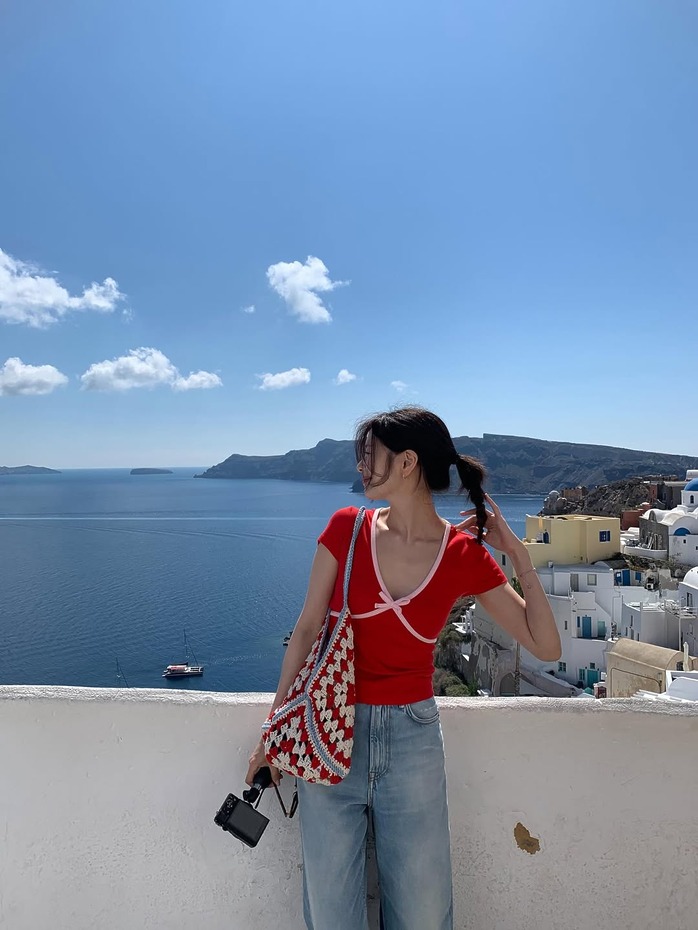 휴가를 맞아 테마 컬러를 정하는 것도 좋습니다. 평소 도전하지 못한 색도 여행지에서는 쉽게 시도할 수 있거든요. 정소민은 레드 티셔츠와 크로셰 가방으로 포인트를 줬습니다. 흰 벽과 푸른 지붕이 어우러진 그리스를 배경으로 존재감 확실한 룩이 완성됐죠.