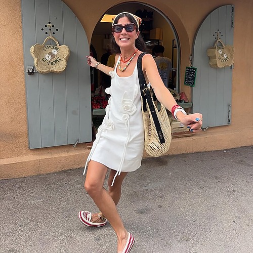 헝가리 F1 경기 관람 룩을 보세요. 우선 머리에는 파스텔 그린 스카프를 우아하게 두르고 시작합니다. 1950년대 영화 주인공이 떠올랐죠. 여기에 화이트 탱크 톱, 미니멀한 쇼츠를 매치하고, 시스루 레이스 숄을 걸쳤습니다. 큰 스카프라고 할 수 있을 정도였죠. 가방 손잡이엔 화려한 패턴의 또 다른 스카프가 묶여 있었습니다. 처음엔 과해 보였지만 신기하게도 이 과함이 오히려 룩의 방향성을 규정하더군요. 직선적인 실루엣이 곡선의 리듬을 타기 시작했고, 시선은 자연스럽게 안야에게 쏠렸습니다.