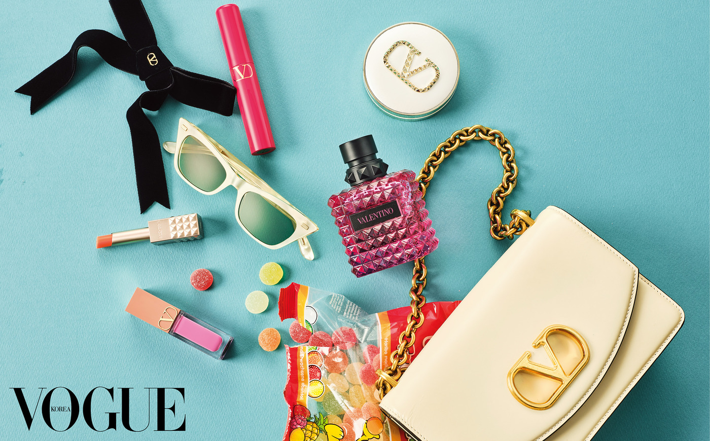 가방 안에서 반짝반짝 빛나는 건 컬러풀한 젤리보다 더 달콤하다. 발렌티노 뷰티의 핑크 블러셔, 오렌지빛 립스틱 그리고 오늘의 ‘나’!