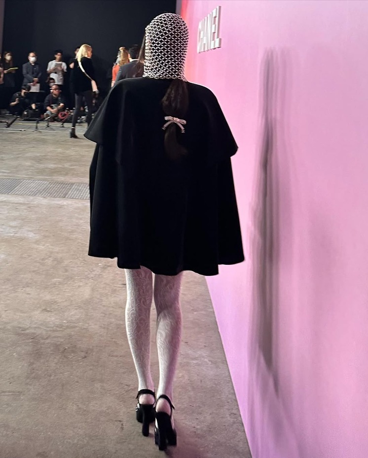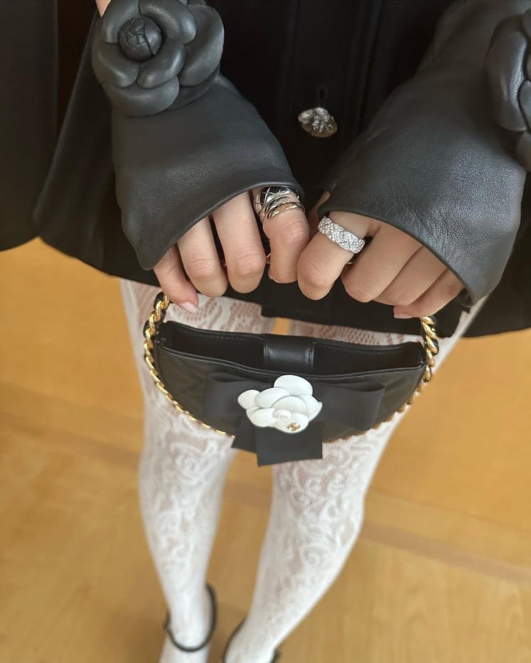 제니는 아주 큰 샤넬 로고를 ‘슈퍼스타’답게 내보이지만, 로고가 드러나지 않아도 샤넬임을 짐작하게 만듭니다. 리본, 진주, 체인, 트위드, 까멜리아 같은 하우스를 상징하는 요소를 자유자재로 섞되 진부하지 않게 비틀죠. 2022-23 도쿄 레플리카 컬렉션에 참석한 룩을 보세요. 진주로 짠 두건, 까멜리아 목걸이, 까멜리아 장갑으로 룩을 채웠습니다. 뒷모습에선 리본이 보였고, 손끝엔 코코 크러쉬 링을 더했고요. 샤넬의 비주얼 코드로 빼곡했죠. 로고를 내세우지 않고도 인간 샤넬이라는 말을 새삼 실감하게 했습니다.