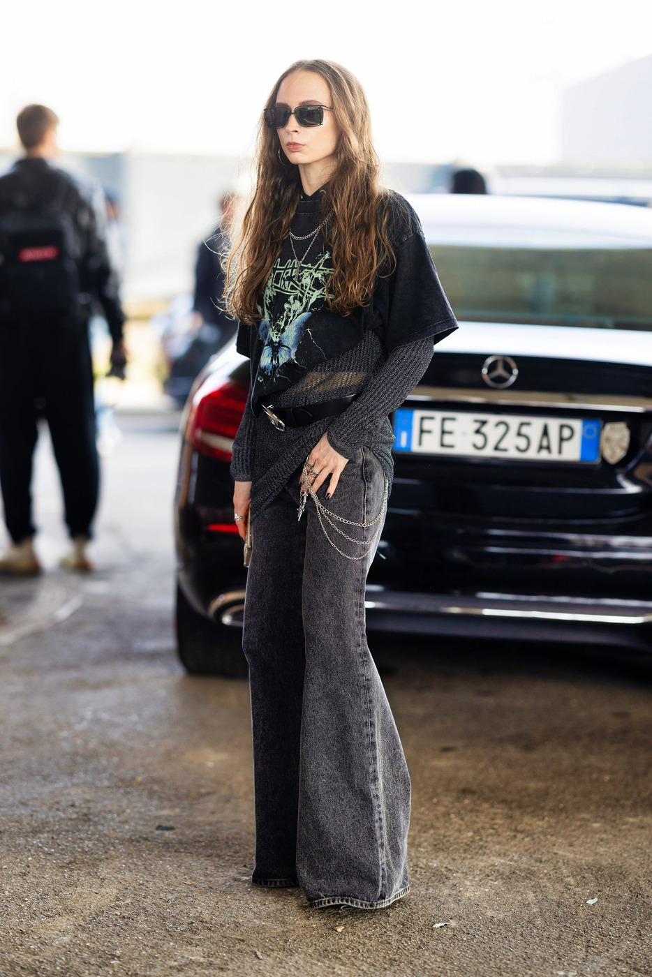 풍자적인 문구나 밴드 로고가 프린트된 그래픽 티셔츠는 여전히 존재감을 드러냅니다. 2000년대 스타일로 엉덩이까지 내려오는 얇은 긴팔 블라우스에 오버사이즈의 그래픽 티셔츠를 레이어드해보세요. 그런지풍의 도회적인 미학을 보여주죠. 여기에 슬림한 플레어 진과 두툼한 힐 슈즈를 매치하면 글램과 캐주얼의 중간 지점을 완성할 수 있습니다.