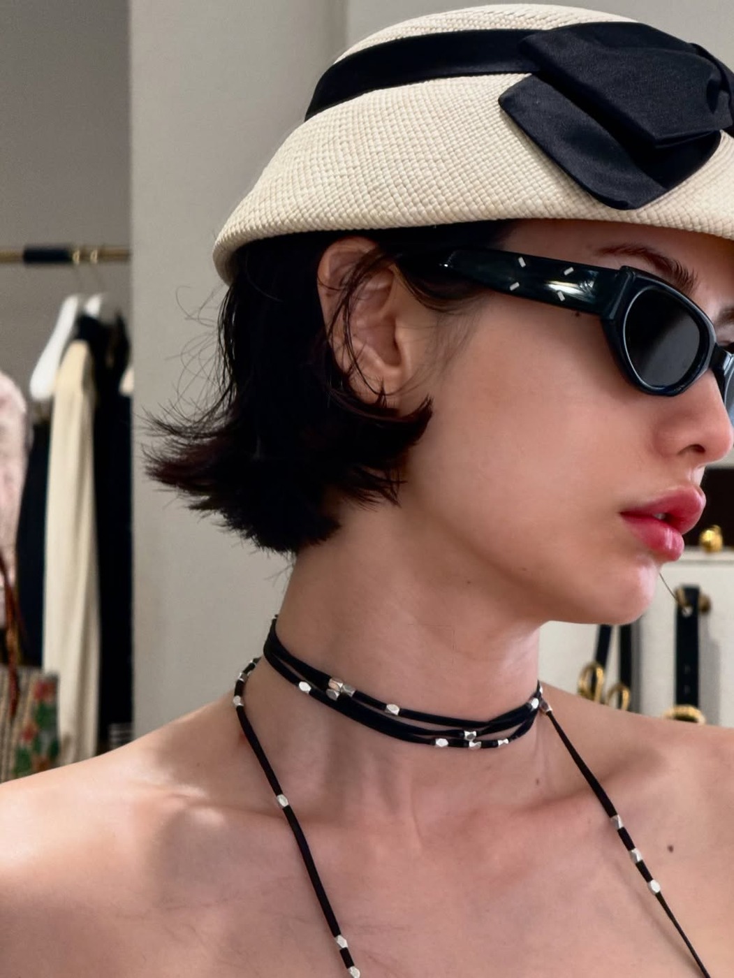 목과 귀 주변이 시원하게 드러나니 액세서리가 묻히지 않고 돋보입니다. 볼드한 귀고리와 목걸이는 단발의 말쑥함과 대비되어 더욱 도드라지고요. 모자나 헤어밴드, 선글라스처럼 얼굴 가까이 위치한 아이템도 효과가 큽니다. 얼굴 주변의 밀도가 확 높아지죠.
