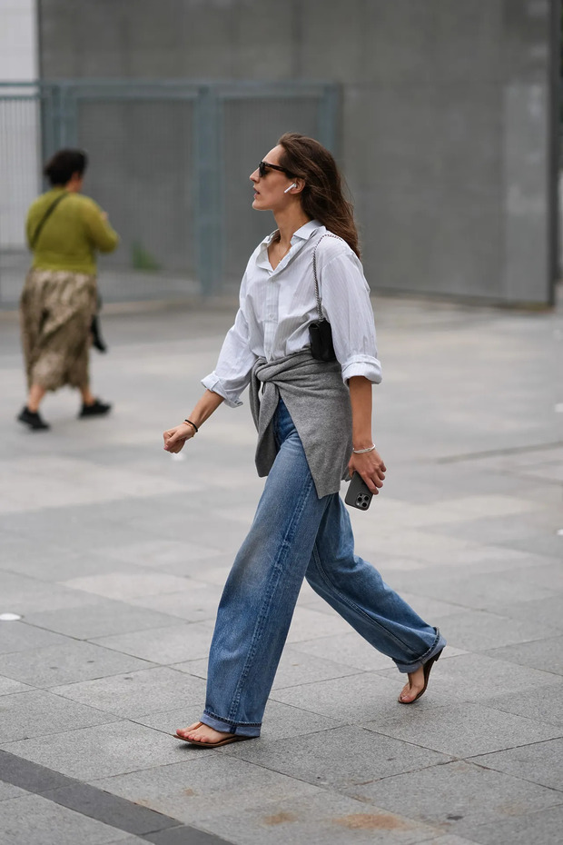 스타일링은 팀플레이라는 걸 잊지 마세요. 롤업 데님과 샌들이 시선을 받으려면 상의는 절대 튀어선 안 됩니다. 오버사이즈 셔츠나 크루넥 티셔츠처럼 단출하게 힘을 뺀 아이템을 택하세요. 상체가 과하게 드레스업되면 청바지의 무심한 매력이 사라지니까요. 상의를 편안하게 두면 자연스럽게 바지와 신발로 시선이 이어집니다.