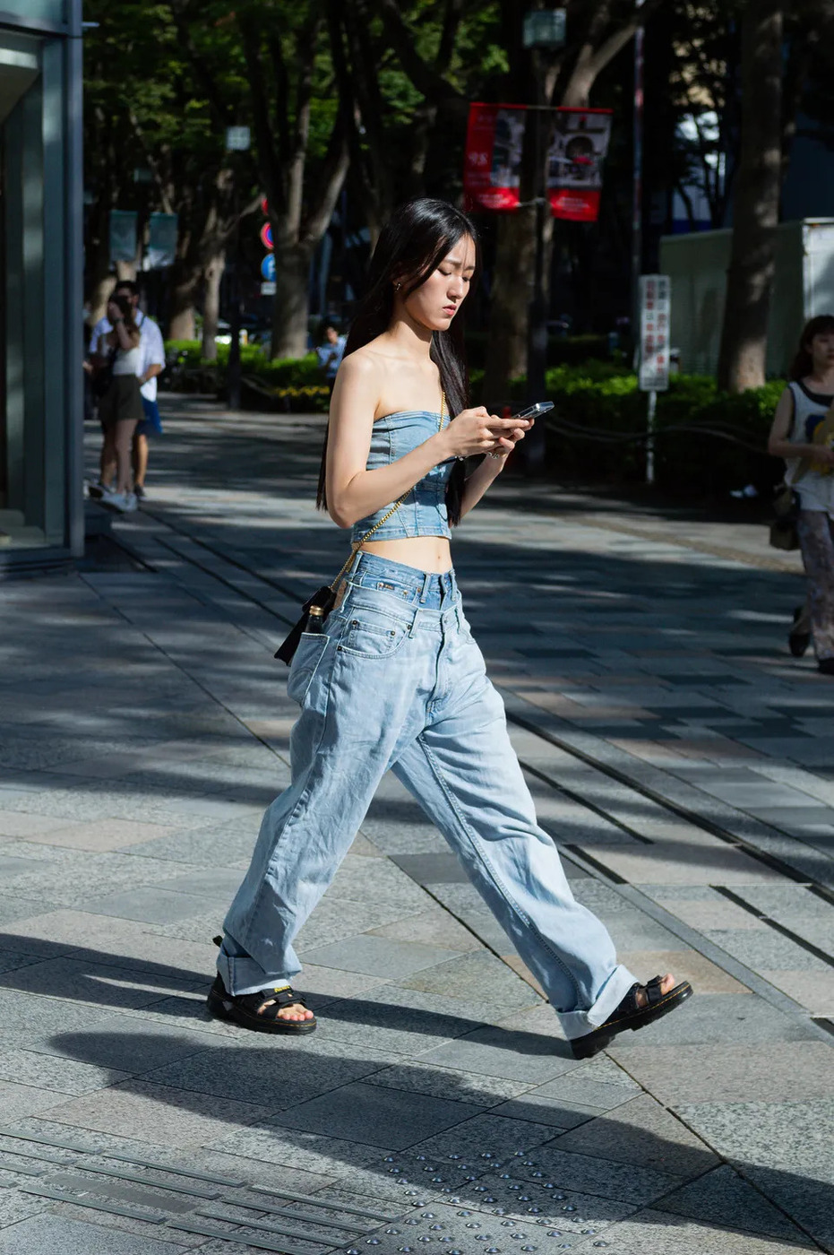 롤업 데님을 입는 만큼 신발로 포인트를 주는 것도 훌륭한 선택입니다. 레드처럼 강렬한 컬러나 두툼한 플랫폼 굽 모두 좋습니다. 이때 청바지의 안감과 겉감의 컬러 대비를 고려하세요. 샌들의 채도가 높다면 대비가 크지 않을 때 안정적입니다. 레이어가 복잡해 보이지 않으니까요. 반대로 신발이 차분한 컬러라면 롤업으로 드러난 안감이 살짝 밝아도 좋습니다. 룩에 리듬을 더해주니까요.
