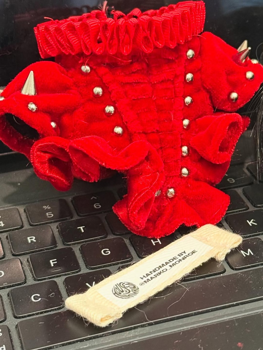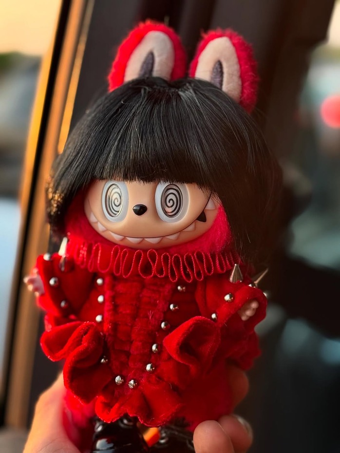 레이디 가가는 한 수 위였습니다. 날렵한 블랙 켈리 백에 ‘특별한’ 라부부를 매달고 있었거든요. LA 기반 아티스트 마르코 먼로(Marko Monroe)가 레이디 가가를 그대로 본떠 커스텀한 라부부였죠! 가가가 뮤직비디오 ‘아브라카다브라(Abracadabra)’에서 입은 러플 장식의 붉은 의상에서 영감받아 만들었다고 합니다.
