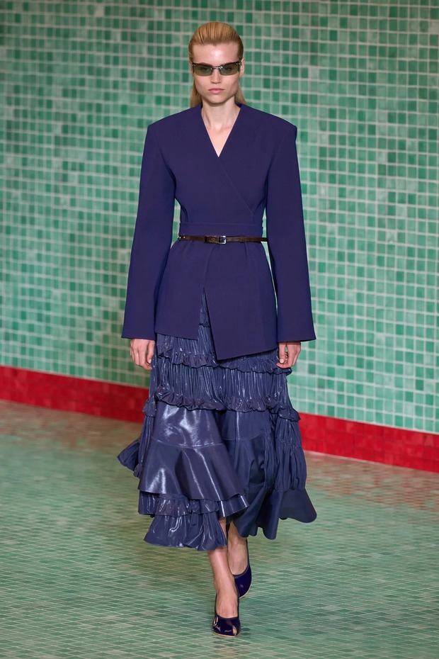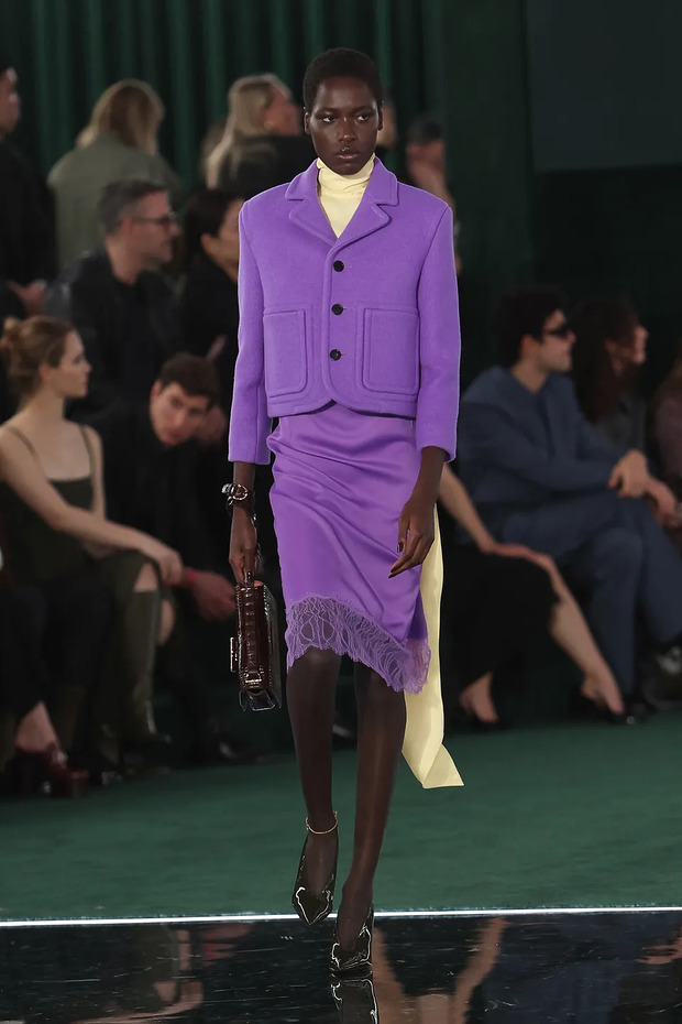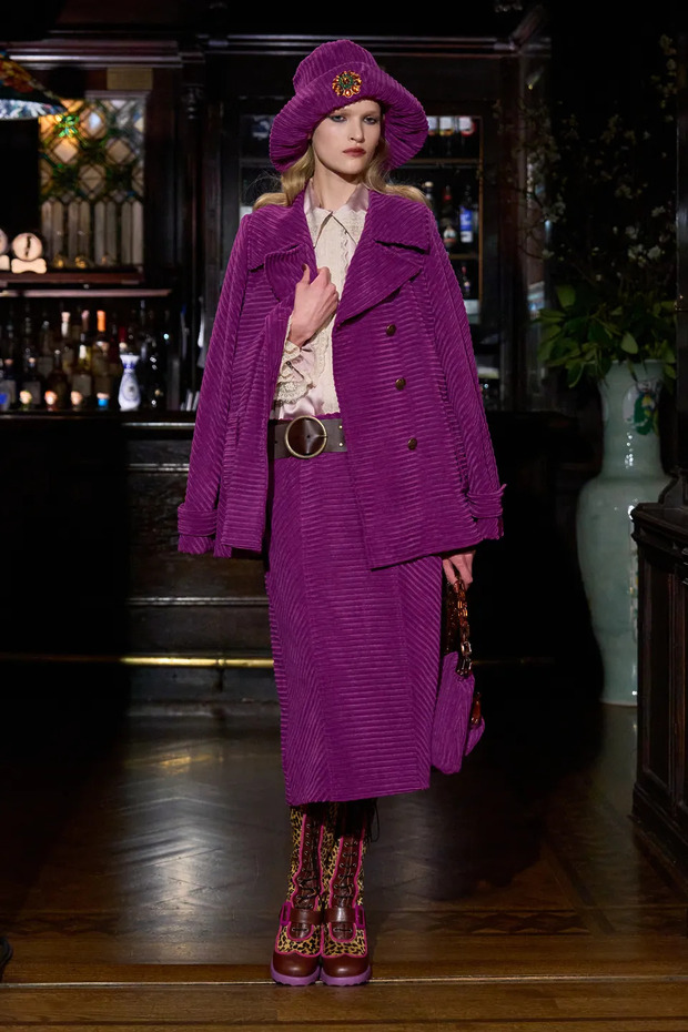 특히 구찌의 2025년 가을/겨울 컬렉션에서는 하우스의 모든 시대를 아우르는 감성이 드러났는데요. 알레산드로 미켈레가 소환했던 1960년대 실루엣, 사바토 데 사르노의 실크 슬립 드레스, 톰 포드 시절이 떠오르는 글램한 디테일까지 모두 담겼죠. 그중 가장 시선을 끈 건 역시 퍼플이었습니다. 피코트, 시어 드레스, 셋업, 심지어 힐과 스타킹까지 퍼플 컬러로 등장했죠.