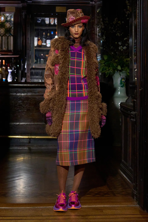 콜린 앨런은 “호불호 갈릴 컬러”라고 표현한 퍼플을 사용해 여성의 몸과 정신 그 자체를 기념했습니다. 안나 수이는 1930년대 스크루볼 코미디(Screwball Comedy) 속 여주인공을 상상하며 형광 디테일을 섞은 보라색 페어아일 니트와 셋업을 선보였죠.
