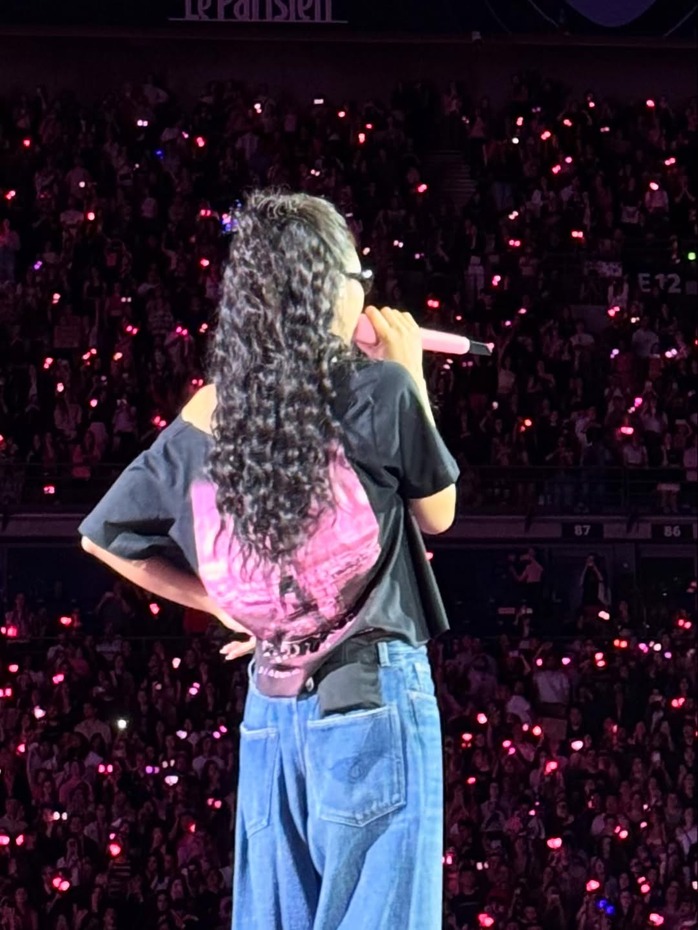 제니는 블랙핑크 자체 제작 티셔츠를 오버사이즈로 입었습니다. 전체적으로 여유 있는 모양새지만 어깨 한쪽을 과감하게 드러내 시선을 끌었죠. 힙합 무드를 유지하면서도 편안하게 보이도록 헐렁한 청바지와 아디다스 가젤 스니커즈를 매치했습니다. 콘서트 관객으로서도 손색없는, 활동적이면서 멋까지 챙긴 조합이었습니다.