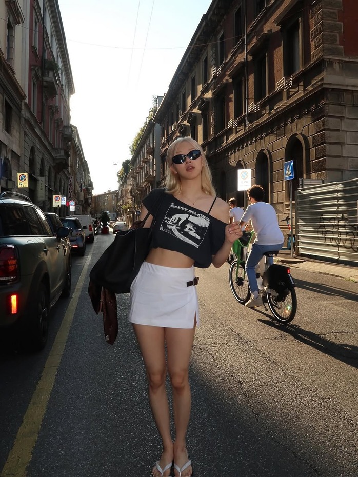 로제는 오프 듀티 날, 원 숄더 톱에 미니스커트를 매치했습니다. 하이 웨이스트 스커트로 하체를 단정하게 잡아준 대신, 짧은 길이의 티셔츠로 전체적인 실루엣의 균형을 맞췄습니다. 슈즈는 플립플롭을 신었고요. 이 심플한 룩에 포인트 역할을 톡톡히 해낸 게 바로 빈티지한 티셔츠 프린팅입니다. 원 숄더 톱 특유의 드레시하고 섹시한 무드가 낯간지럽다면, 로제처럼 빈티지한 티셔츠를 택해보세요! 충분히 캐주얼하게 입을 수 있습니다.