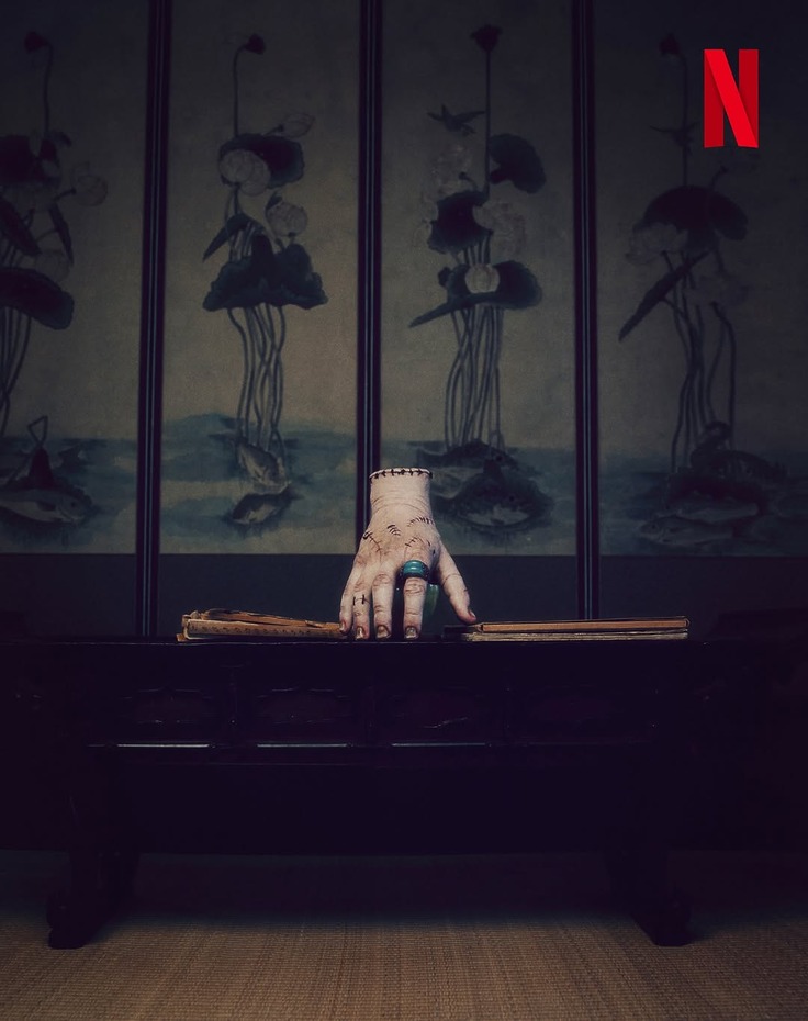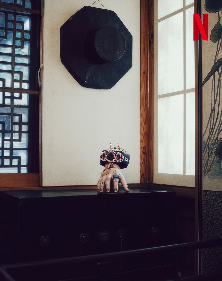 외형은 잘린 손이라 무서울 수 있어도, 막상 내면은 다정한(!) 씽은 병풍을 배경으로 오묘한 분위기를 자아냈습니다. 손가락에 끼워진 가락지가 시선을 끄는군요.