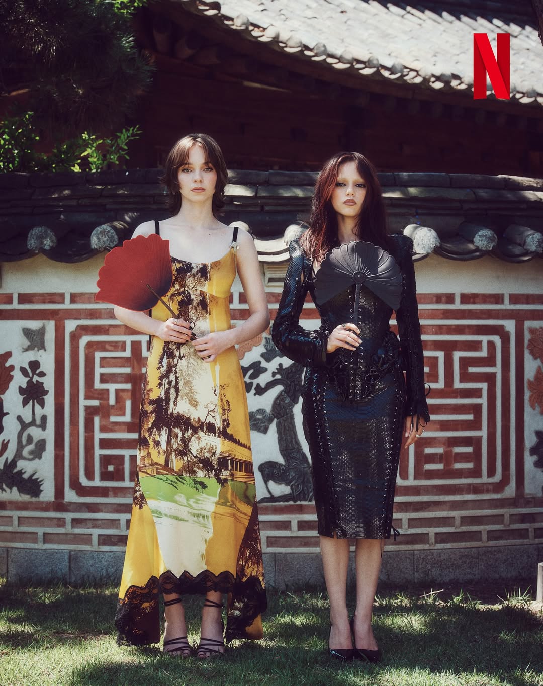 화려한 드레스를 입고 고궁 벽 앞에 선 제나 오르테가와 이니드 역의 에마 마이어스! 두 사람이 손에 들고 있는 부채도 이질감 없이 어울리죠.