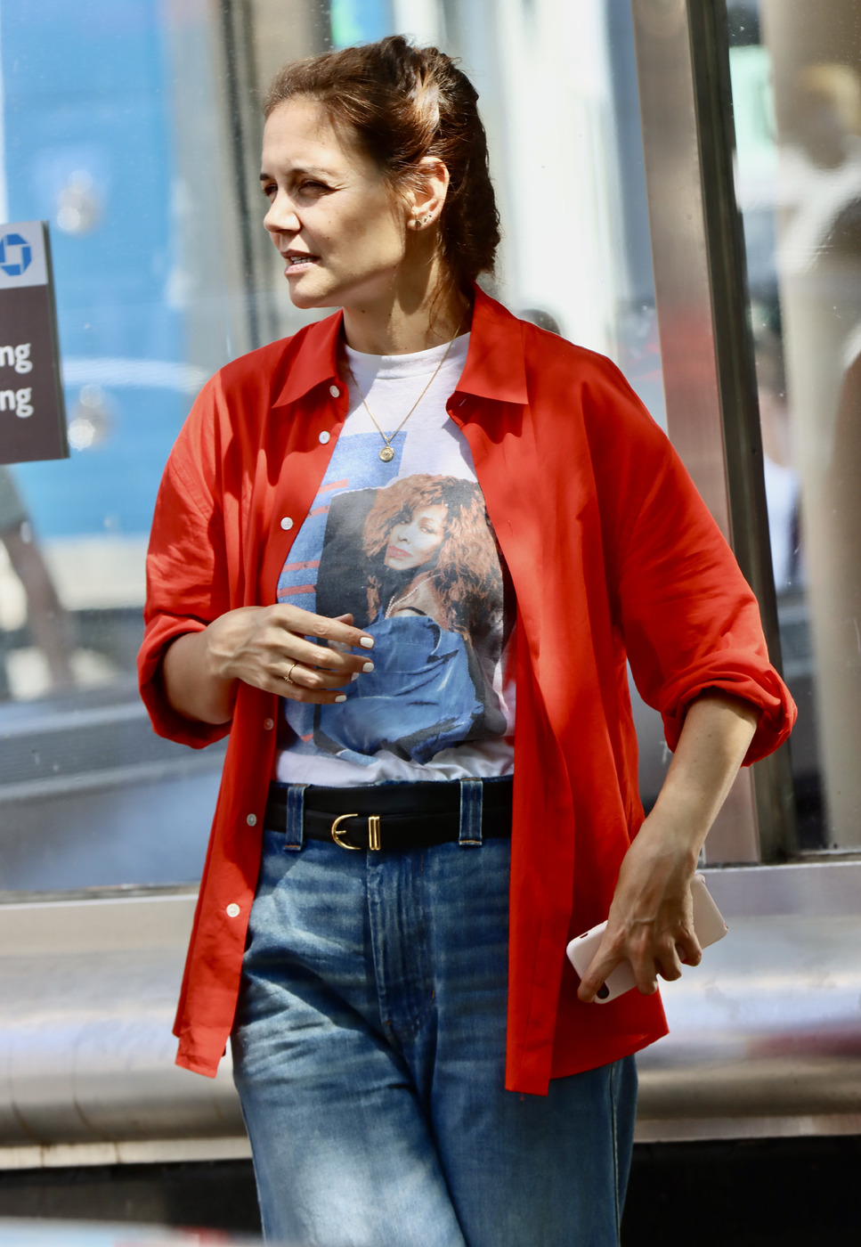 케이티 홈즈는 올해 환절기를 오버 셔츠 스타일링과 함께 보내기로 마음먹은 듯합니다. 당장 지난 6일에도 Y2K풍 탱크 톱 위에 그런지한 분위기의 체크 셔츠를 걸치며 같은 공식을 따랐거든요. 5일에는 빈티지 숍에서 발견한 듯한 티셔츠와 체크 셔츠를 매치했습니다. 두 룩 모두 비교적 얌전한 무드의 플리츠 팬츠를 활용한 덕분인지, 맨 처음 살펴본 룩보다 차려입은 듯한 느낌을 주는군요.