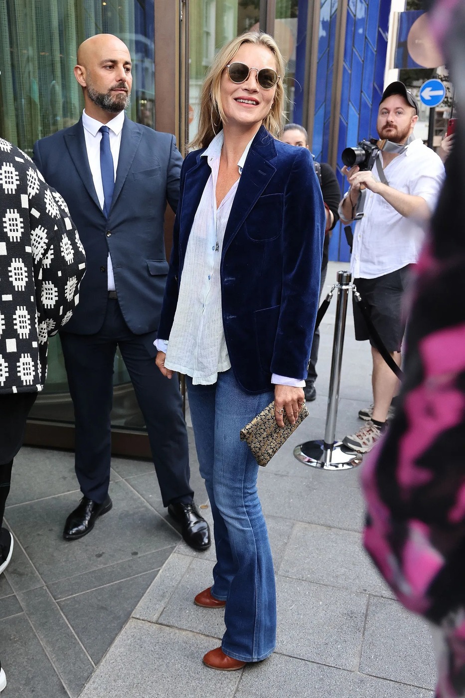 마지막으로 케이트 모스는 부츠컷 진을 비즈니스 캐주얼 스타일로 변형했습니다. 벨벳 블레이저, 오버사이즈 셔츠, 그리고 앞코가 둥근 갈색 부츠와 매치했죠. 과연 90년대 패션 아이콘답게 좋은 청바지 한 벌만으로도 근사한 룩을 연출할 수 있음을 증명한 셈입니다.