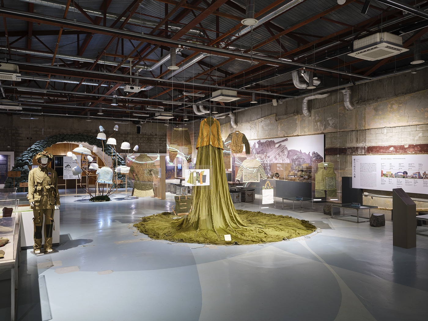 메인 전시장인 갤러리 그리브스는 미군 볼링장이었다. 이곳에선 폐기된 전투용품을 재활용한 작품이 눈에 띈다. 오상민의 ‘쏘일 투 쏘울’은 방탄복과 방탄 차량 등에 쓰이다 폐기 예정이던 아라미드 원사로 설치 작품을 만들었다. 브랜드 래코드(RE;CODE)는 2012년부터 2019년까지 군용 소재 활용 프로젝트를 진행했는데, 버려지는 텐트와 군복, 낙하산 등을 매입하고 세척, 해체해 새로운 의류로 재탄생시켰다. 전시에서는 그렇게 완성된 의상과 가방 등을 볼 수 있다.