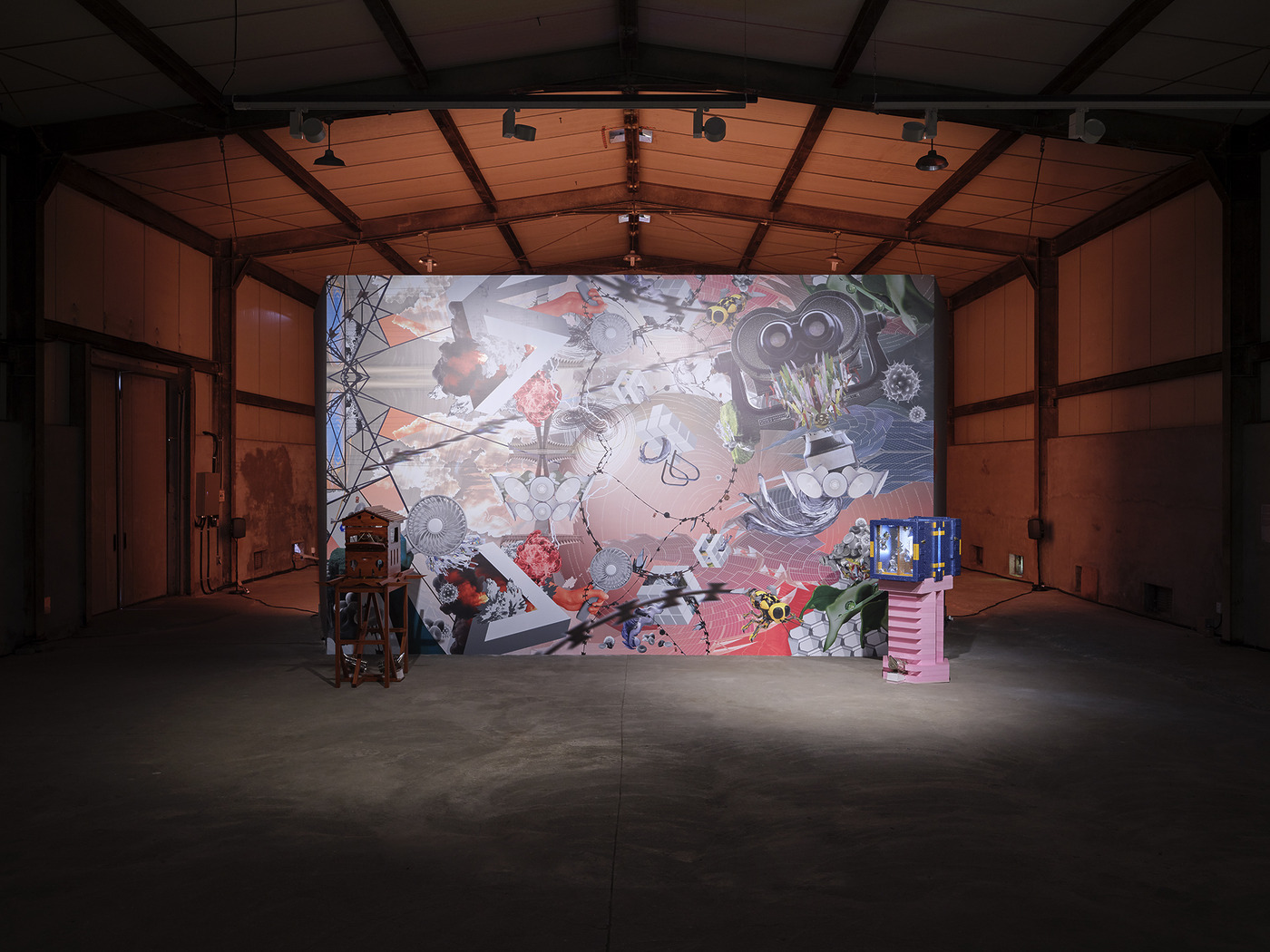 통일촌 마을에선 우선 곡식 창고로 들어섰다. 이곳은 실제 주민들이 사용하는 곳으로 가을 수확 철이 오기 전까지 전시장으로 활용된다. 중앙에 양혜규의 설치 작품 ‘디엠지 비행’이 자리한다. 손풍기, 꽃가루, 로봇 벌, 수력발전 댐, 송전탑, 번개 등 서로 연관 없어 보이는 물건이 뒤엉킨 평면 작업이다. 전시 주최 측은 “한반도 분단의 상징인 비무장지대 이면에 인간계와 자연계의 (비)가시적 힘을 보여주는 작품”이라고 설명한다.