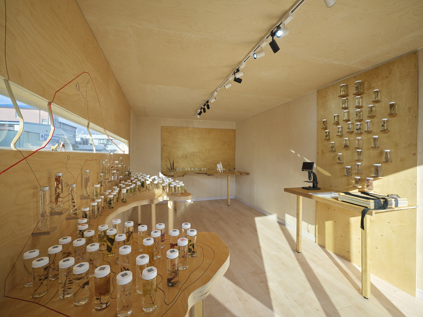 곡식 창고를 나오자 맞은편에 아담한 전시 공간이 등장한다. 작가 박준식이 2019년부터 머물며 작업해온 공간이다. 박준식은 DMZ 일대에 서식하는 식물을 수집해 표본화했다. 김준 작가의 ‘혼재된 신호들’은 민간인 출입이 통제된 지역에서 채집한 소리를 박스 형태 설치물에 담았다. 이 사운드박스는 회전하기에 실제 자연 속에 있는 것처럼 소리가 사방에서 들려온다.