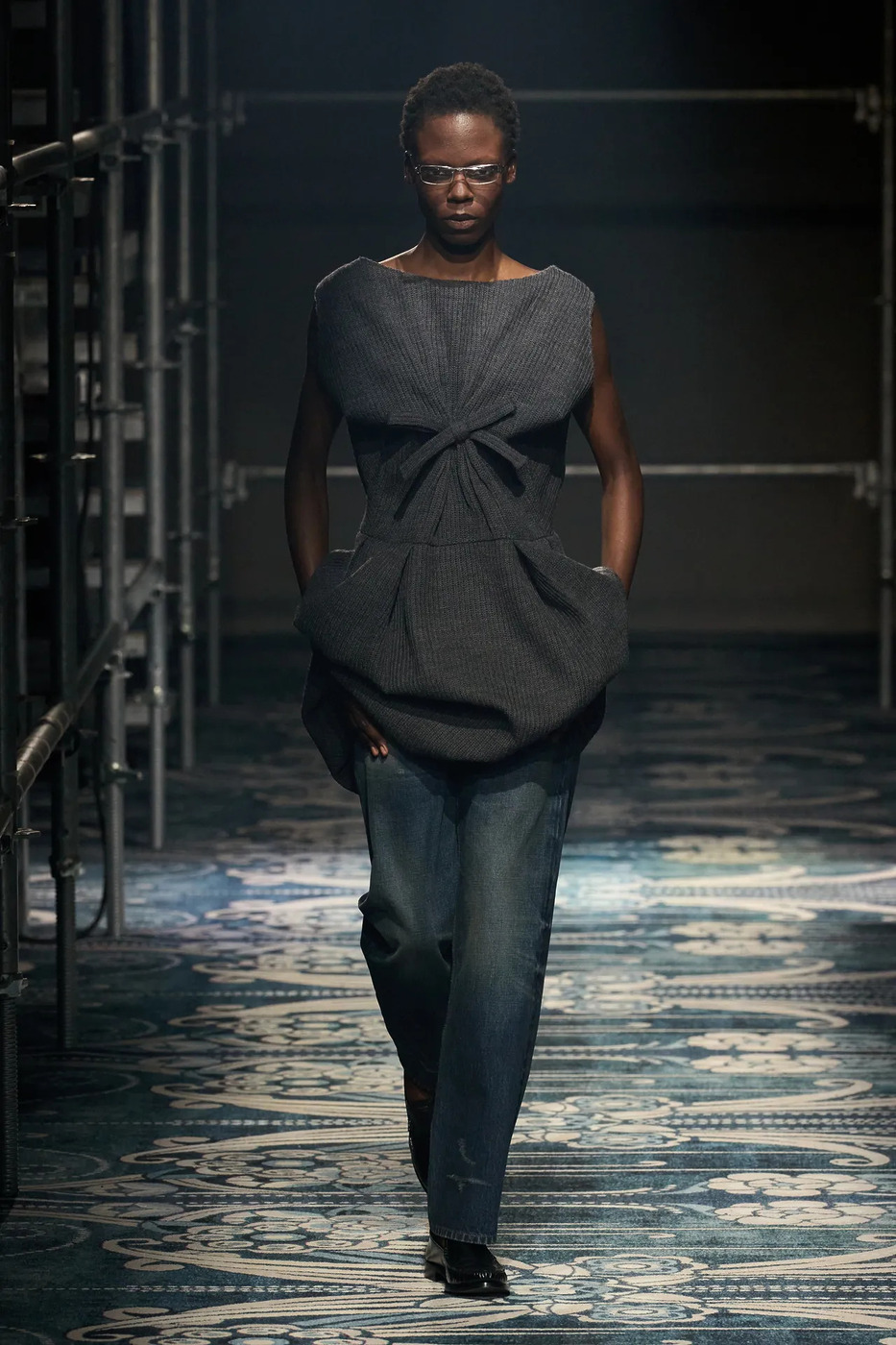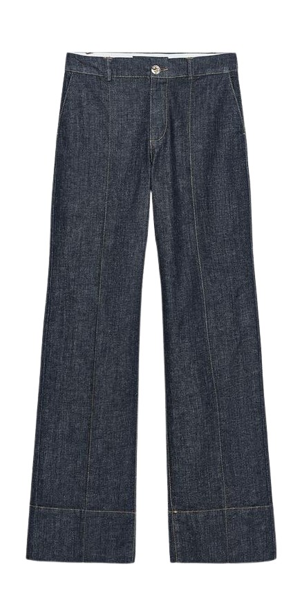 올가을 컬렉션은 상의가 꽤 과감합니다. 블록 컬러가 화려하고, 러플이나 리본처럼 큼직한 장식이 쏟아졌죠. 이런 상의를 받쳐주는 데 필요한 건 다크 데님입니다. 루이 비통의 룩을 보세요. 강렬한 컬러와 러플 칼라를 더했지만 룩이 산만해 보이지 않죠. 어두운 배기 핏 데님으로 묵직하게 중심을 잡아주세요.