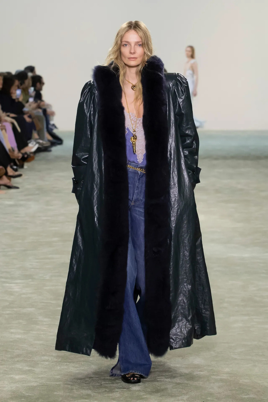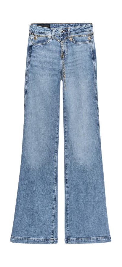 허리선의 높낮이는 룩의 인상을 크게 바꿉니다. 그렇기에 트렌드를 잘 살펴봐야 하죠. 올 가을 겨울에는 골반에 쫙 올라 붙는 하이 라이즈가 우세할 전망입니다. 끌로에는 레이스 블라우스와 체인 벨트에 하이 라이즈 데님을 조합했군요. 다리가 길게 뻗어나가는 그 당당함이 보헤미안 무드를 완성했죠. 부츠컷 라인과도 찰떡궁합이고요.