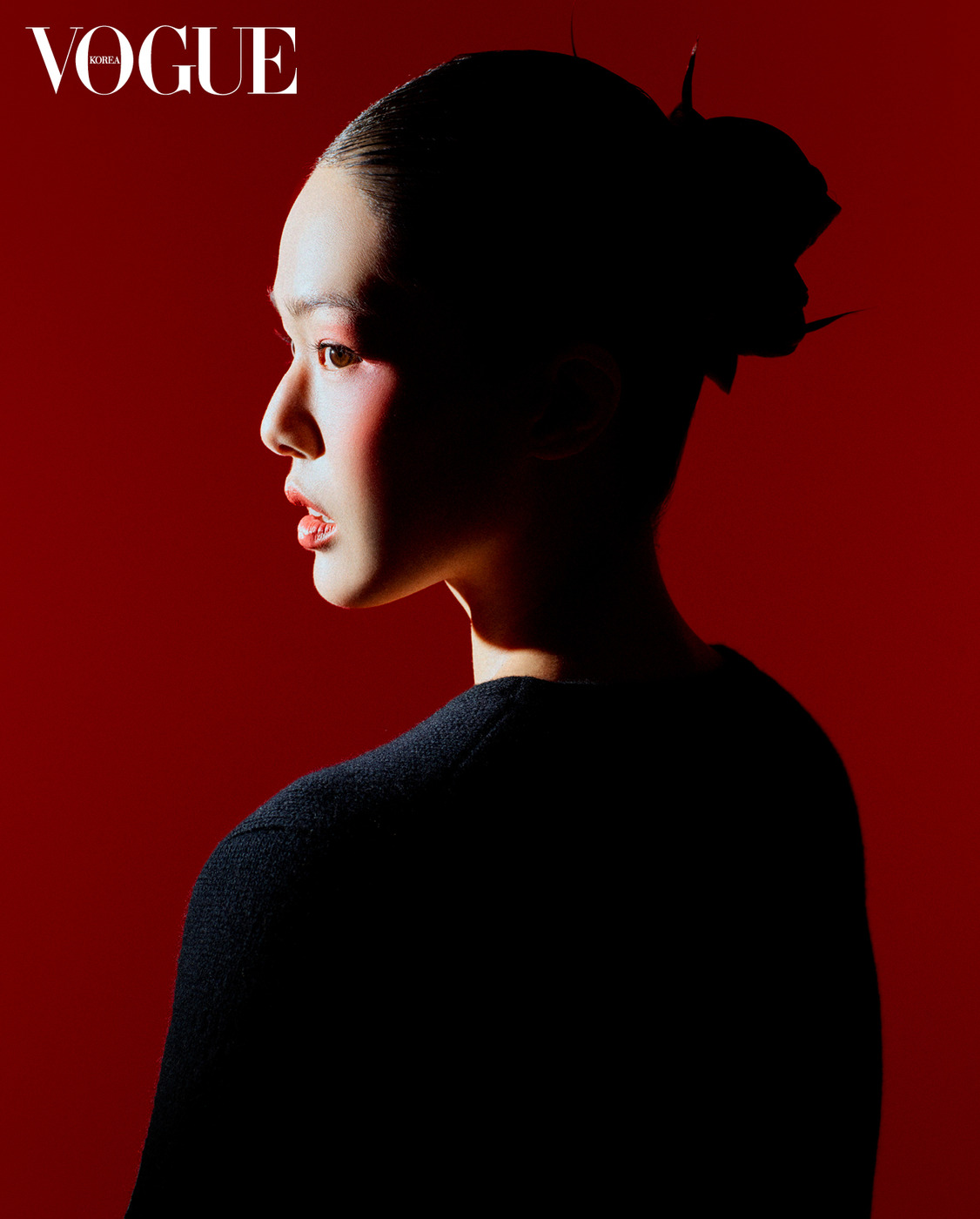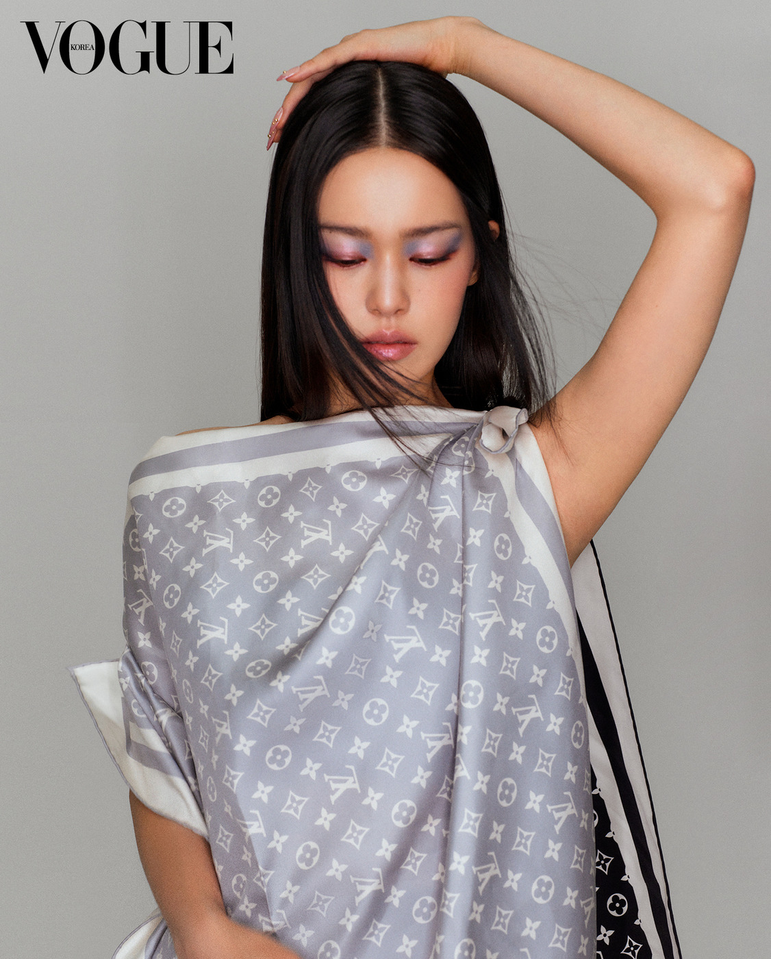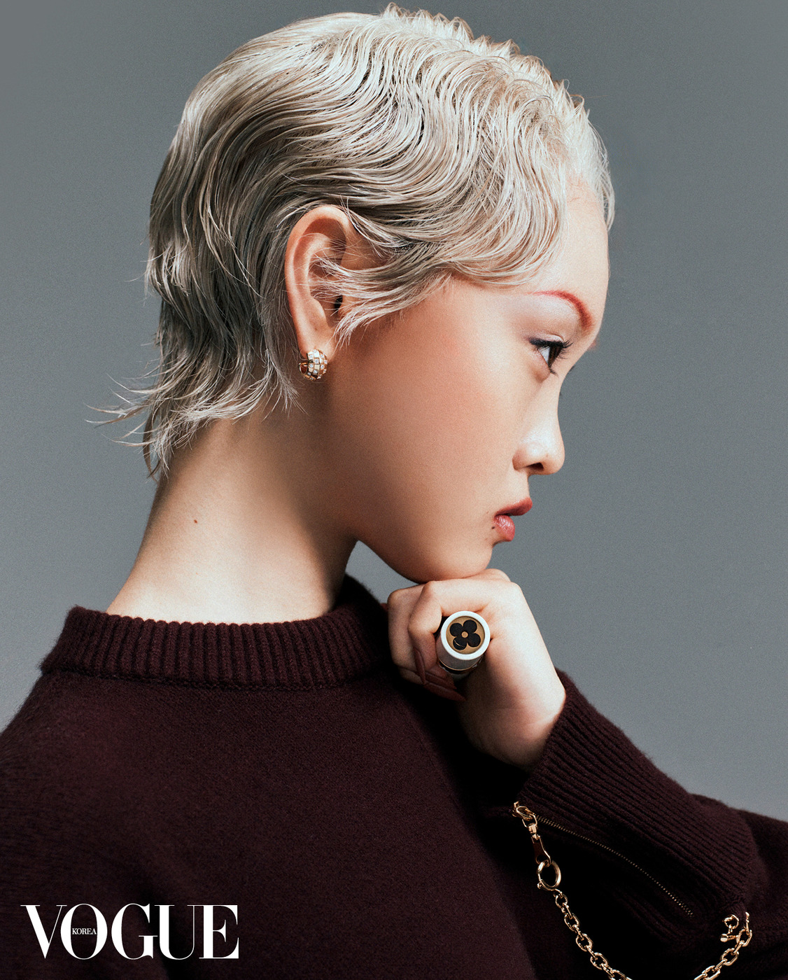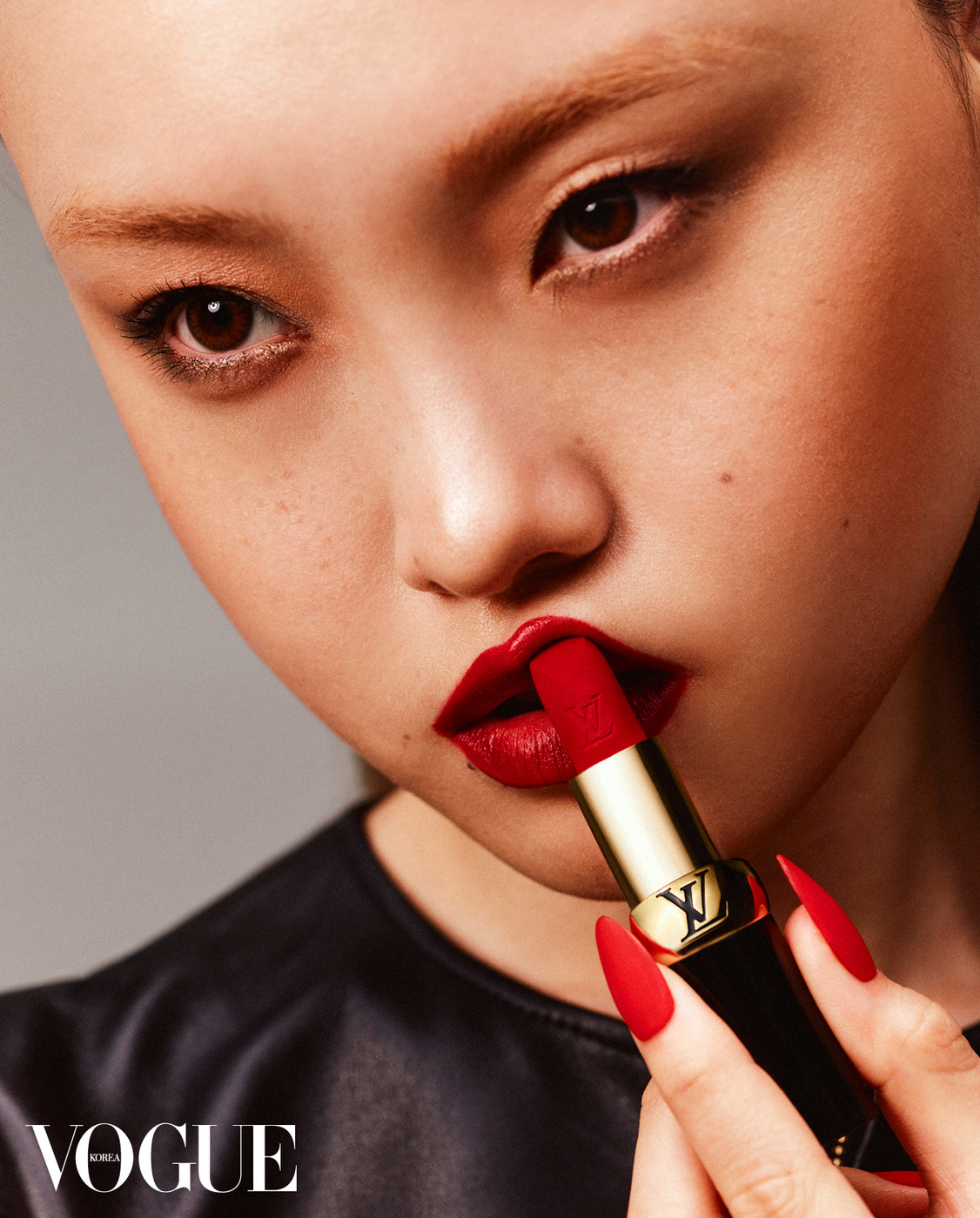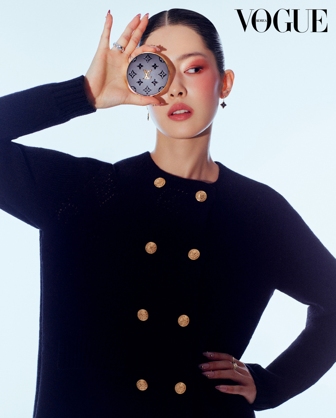 Highest Level 한마디로 표현하면 매우 정제되고 고급스럽다. 그 안엔 루이 비통의 예술성과 장인 정신, 최고의 소재에 대한 집념이 엿보인다. 두 눈과 뺨은 ‘LV 옴브레 #896 모노그램 루즈’와 ‘LV 옴브레 #650 웨이킹 던’의 합작. 입술은 ‘LV 루즈 새틴 #102 패스포트 투 파리’에 ‘LV 루즈 매트 #105 누드 네세서리’를 중앙에 살짝 덧바른 것. 제품은 라 보떼 루이 비통. 더블 브레스트 카디건, 드롭 이어링과 반지는 루이 비통(Louis Vuitton).