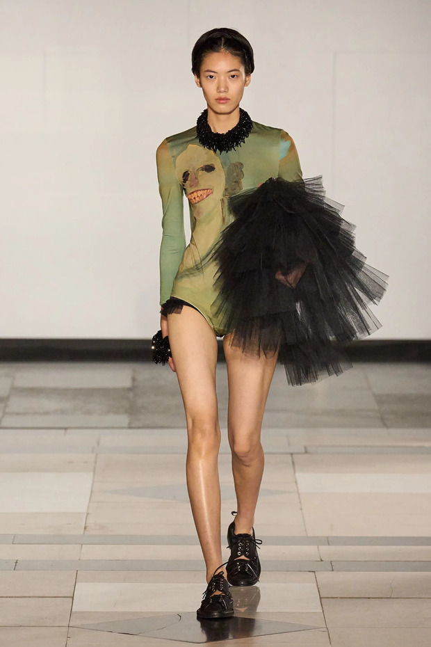 고스 스타일이 아직 친숙하지 않은, ‘초심자’를 위한 스타일링도 있습니다. 바로 지난주, 제나 오르테가가 한국을 방문했을 때 선보인 룩이죠. 그녀는 시몬 로샤의 톱과 스커트를 매치한 모습으로 간담회에 참석했는데요. 톱의 기괴한 그림과 퀭한 메이크업의 시너지 덕분에 으스스한 무드가 느껴졌지만, 절대 과해 보이지는 않았습니다.