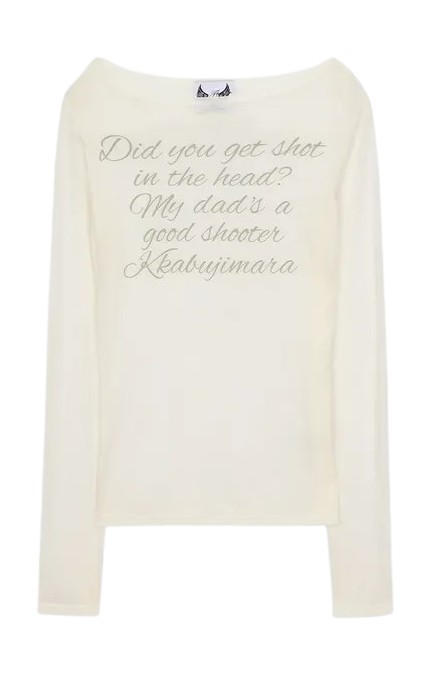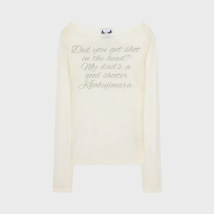 이 티셔츠는 정가 5만9,000원(현재 쇼핑 플랫폼에서 3만원대로 예약 판매 중)의 가격대는 물론 ‘Did you get shot in the head? My dad is a good shooter. Kkabujimara’라는 유쾌한 문구로 눈길을 끌었는데요. 한국어 발음을 그대로 표기한 ‘까불지 마라’가 웃음을 자아내죠? 또 텐셀 소재의 시어한 메시 패브릭, 화이트 조합이라 지금부터 가을까지 두루 활용하기 좋은 아이템입니다. 제니는 이 티셔츠와 함께 치마바지 스타일의 ‘레얼리 어라이크(Rarely Alike)’의 플레어드 미디스커트 팬츠, 실버 롱 네크리스, 미우미우 테크니컬 발레리나 슈즈를 매치해 힙하면서도 쿨한 블랙&화이트 룩으로 연출했어요.