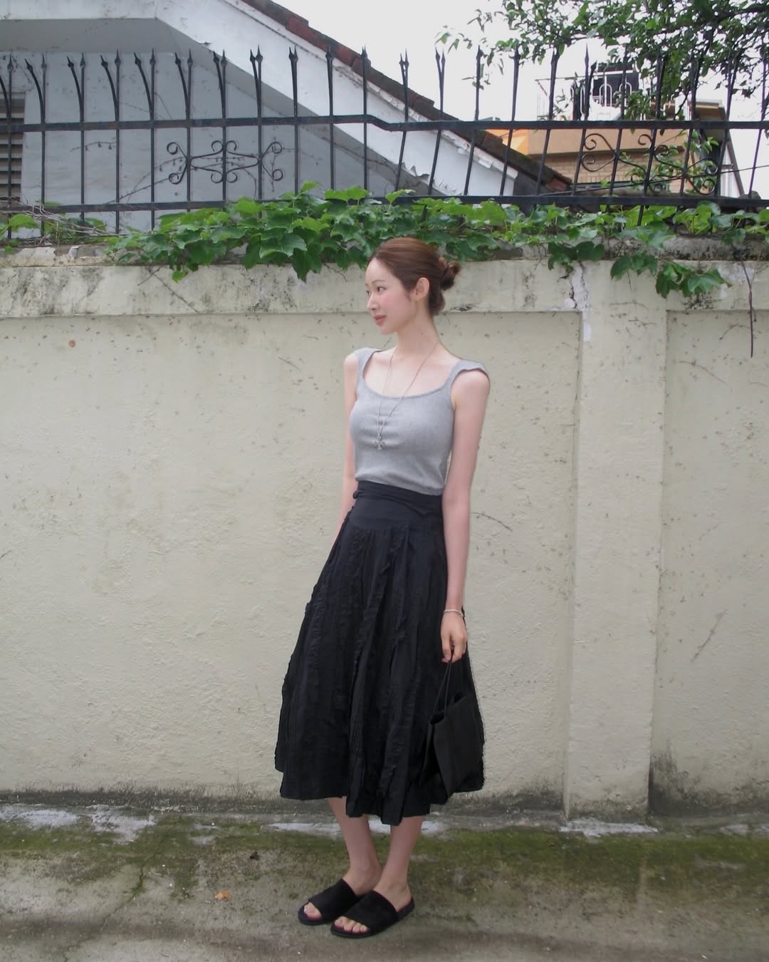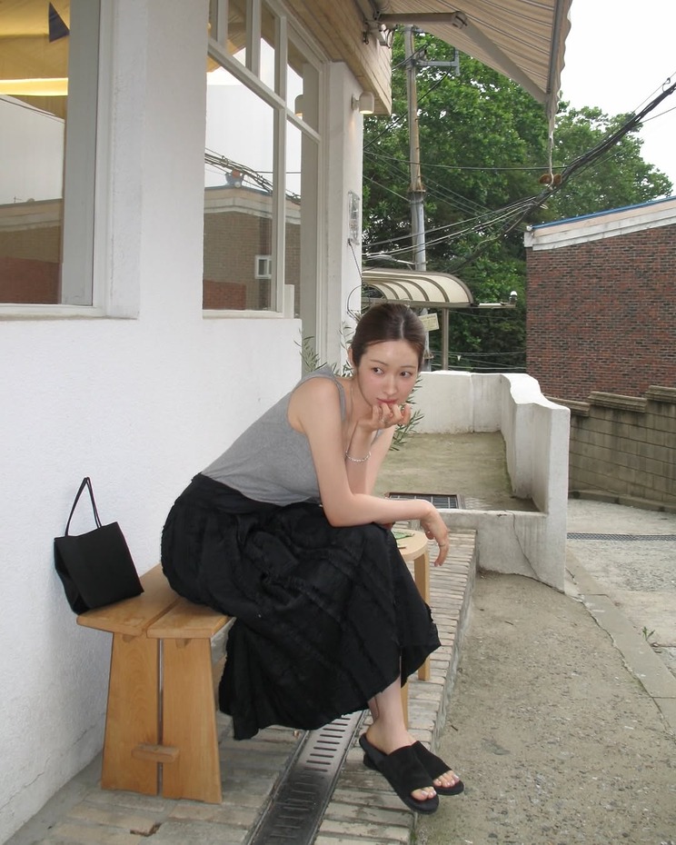 동일한 브랜드의 레이어드 러플 디테일 드레스를 스커트처럼 연출한 것도 눈여겨볼 지점입니다. 저지 소재 톱에 코튼 러플 스커트로 풍성한 라인을 연출했어요. 여기에 요즘 셀럽들 사이에서 인기인 더 로우의 세실리 톱 핸들 백, 스웨이드 슬라이드를 더했죠. 액세서리를 블랙으로 통일한 덕분에 룩의 무드가 더욱 정제되고 깔끔한 인상을 줍니다.