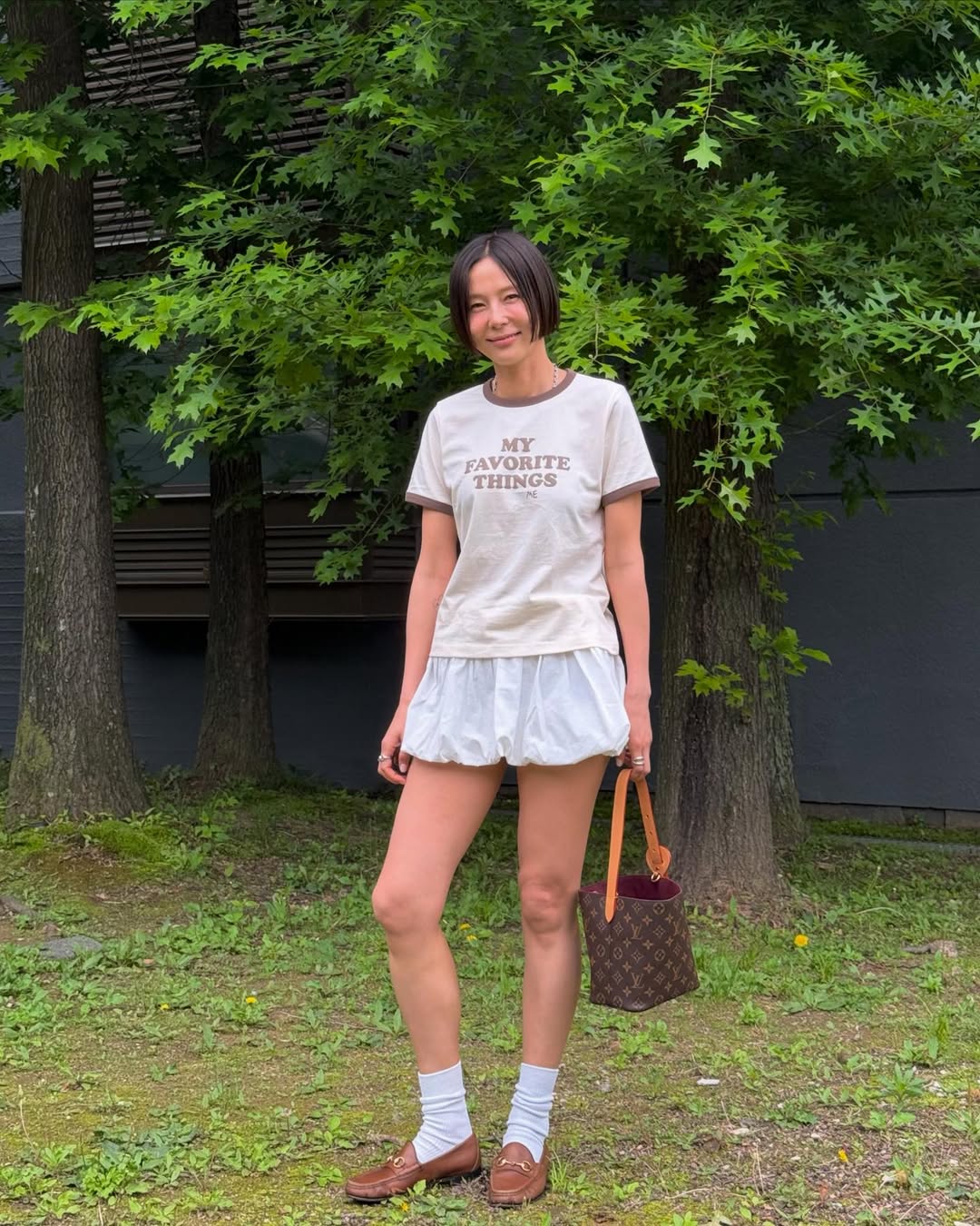 김나영은 크림과 브라운 조합의 링거 티셔츠에 화이트 벌룬 스커트를 매치해 러블리한 위트가 묻어나도록 연출했어요. 마냥 스포티하지 않게, 벌룬 스커트를 매치한 의외의 선택이 룩의 한 끗을 결정했죠. 경쾌한 미니 길이 스커트는 로맨틱하고 걸리시한 분위기도 자아냅니다. 여기에 최근 인기템으로 부상 중인 미니 버킷 백 스타일의 루이 비통 올인 BB, 화이트 삭스와 구찌 브라운 로퍼도 센스 넘치는 액세서리 조합이에요.