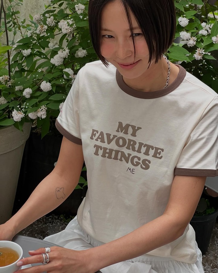 유쾌하면서도 사랑스러운 포인트로 따라 하고 싶은 OOTD를 선보이는 김나영. <보그>와의 인터뷰에서 데일리 룩을 고르는 기준으로 티셔츠를 손꼽을 정도로 티셔츠에 대한 애정을 엿볼 수 있는데요. 이를 증명하듯 김나영은 스포티하면서 레트로한 분위기의 링거 티셔츠로 룩에 활력을 더했어요. 티셔츠는 휠라 제품으로 가격은 4만9,000원입니다.