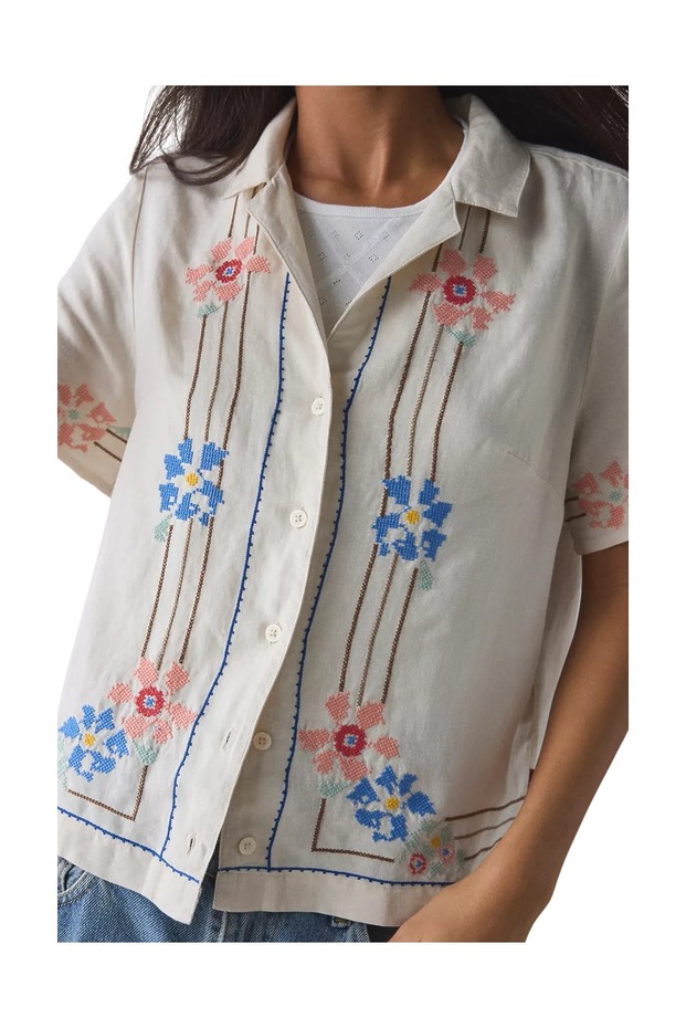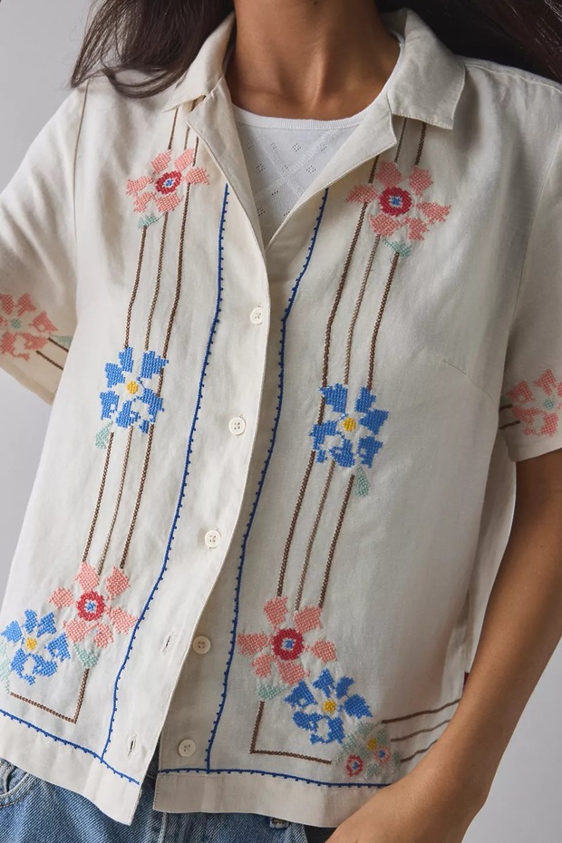 편안하면서도 러블리한 데일리 룩을 선보이는 장희령. 에디터의 눈을 사로잡은 톱은 플라워 자수로 포인트를 준 베이지 컬러 셔츠입니다. 셔츠 하나만 입어도 근사하고, 티셔츠나 슬리브리스 톱 위에 반소매 아우터처럼 툭 걸쳐도 좋을 디자인이죠? 리넨 소재라 지금 계절에도 잘 어울립니다. 이 제품은 리바이스의 ‘소니 캠프 셔츠’로 가격대는 8만9,000원입니다.