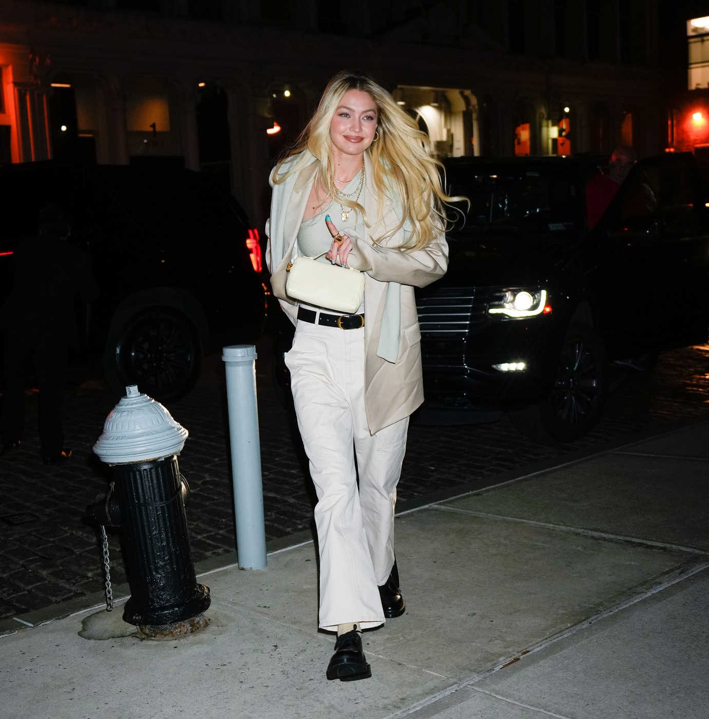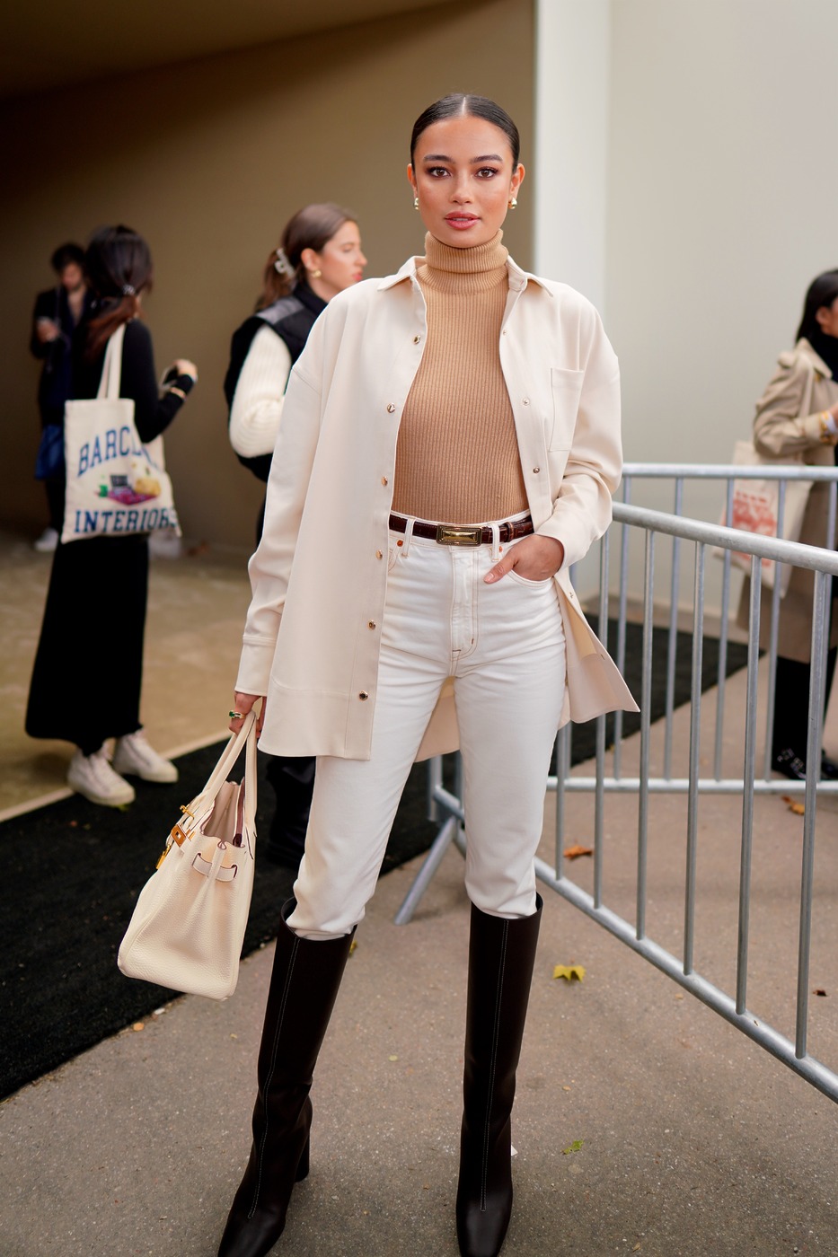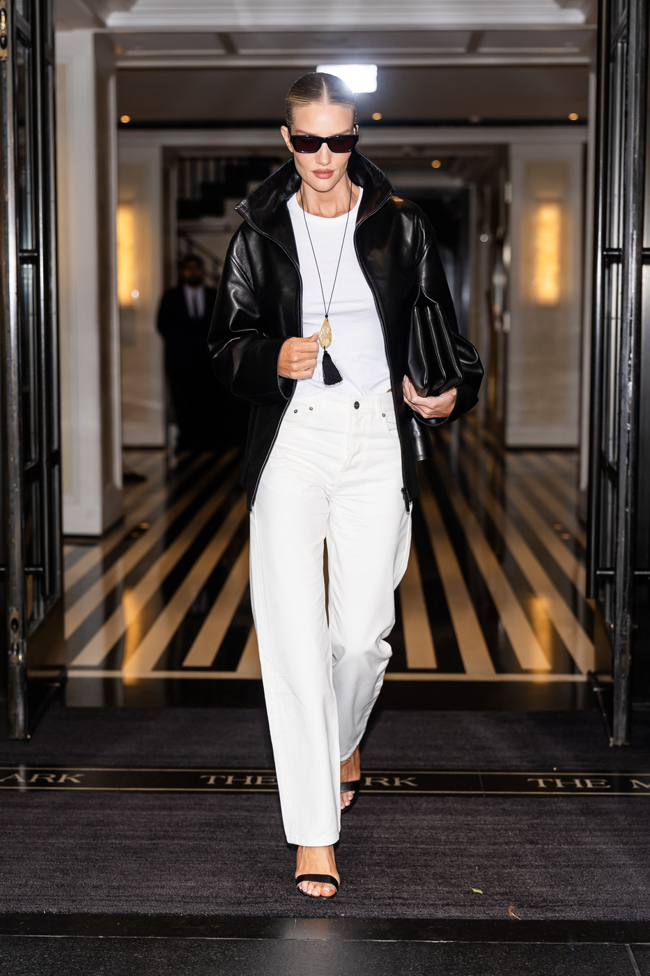 비율의 중요성을 아는 모델들이 선택한 건 힐 샌들입니다. 켄달은 발등을 숨기되 허리 라인을 드러내 긴 다리를 강조했습니다. 이렇게 스타일링하면 다리의 시작과 끝이 일자로 곧게 뻗어서 보이는 면이 모두 다리로 인식되죠. 로지는 허리를 드러내지 않는 대신 발등을 드러냈습니다. 그렇게 하면 바지가 끝나고도 발등 전체가 드러나 안 그래도 긴 다리가 더욱 길어 보이죠. 올 화이트가 부담스럽다면, 켄달처럼 니트를 허리춤에 묶거나 로지처럼 아우터를 걸쳐보세요.