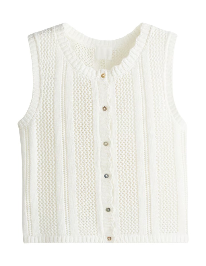 흰 티에 청바지 조합을 조금 비틀어보는 겁니다. 니트 특유의 짜임새 덕분에 기본 티셔츠보다 입체감이 살아나거든요. 흰 컬러를 유지하면 청바지와 담백하게 균형을 이루는 거야 말할 것도 없고요. 늦여름엔 단독으로, 가을엔 재킷 안에 겹쳐 입어보세요.