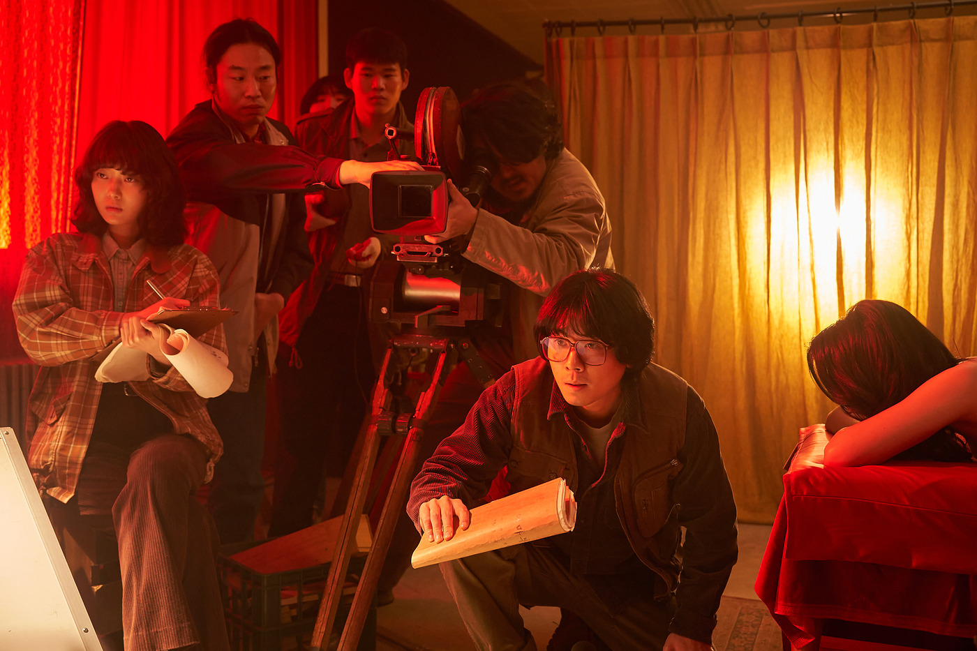 <애마부인>은 하나의 모티브지만, <애마>에서 직접적으로 인용되기도 한다. 실제 영화의 저열한 부분을 조롱하기도 하고, 과감히 해체해 재구성하기도 한다. 특히 여배우의 역할을 확장해 상상하는 방식이 눈에 띈다. 극 중 제작자와 감독에게 주어진 미션은 검열을 피하는 것이다. 어떻게 하면 배우가 노출하지 않고도 노출한 것 같은 장면을 만들 수 있을까. 이때 결정적 힌트를 찾아내는 것은 신인 배우 신주애(방효린)다. 이런 영화에 출연한 배우가 노출과 베드 신을 난처해한 것이 아니라, 오히려 주도적으로 이끌었다는 설정을 밀어붙이면서 새로운 서사를 부여하는 것이다. 실제와 무관하지만, ‘그 시절 배우들도 분명 치열하게 고민했을 것’이라는 시선을 담아낸 가상 역사극적 상상력이다. 하지만 그렇다고 해서 <애마>가 <애마부인>을 낭만적으로만 인용하는 것은 아니다.