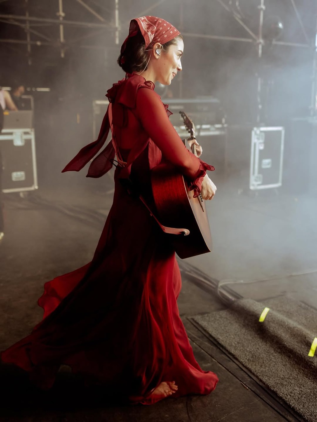 마침 글래스톤베리에서 그레이시 에이브럼스가 공연을 했습니다. 옥스블러드 컬러의 로다르테 드레스는 그녀를 위해 맞춤 제작된 듯했죠. 같은 색으로 맞춘 헤어 액세서리는 아주 익숙한 아이템이었습니다. 바로 대각선으로 접은 반다나였죠. 2000년대 초 크리스티나 아길레라의 스타일과 비슷했어요.