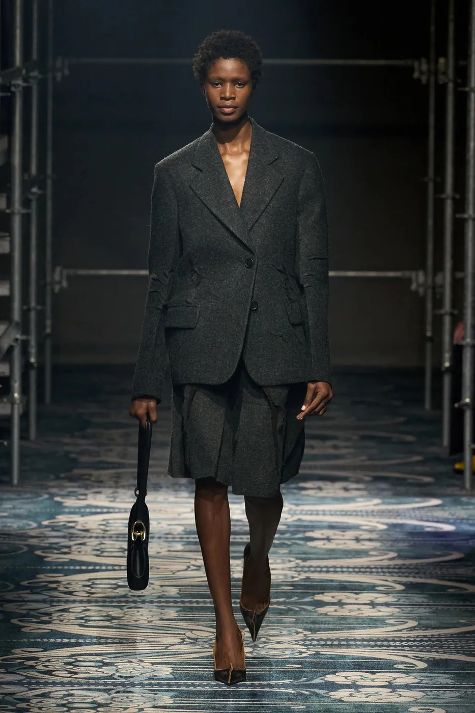이제 디테일을 살펴볼까요. 프라다와 마이클 코어스는 어깨선이 직선으로 쭉 뻗은 오버사이즈 재킷에 무릎까지 내려오는 스커트로 셋업을 이뤘습니다. 펌프스 힐도, 부츠도 곧잘 어울리죠. 컬러 포인트 없이도 심심하지 않은 룩이 완성됩니다.