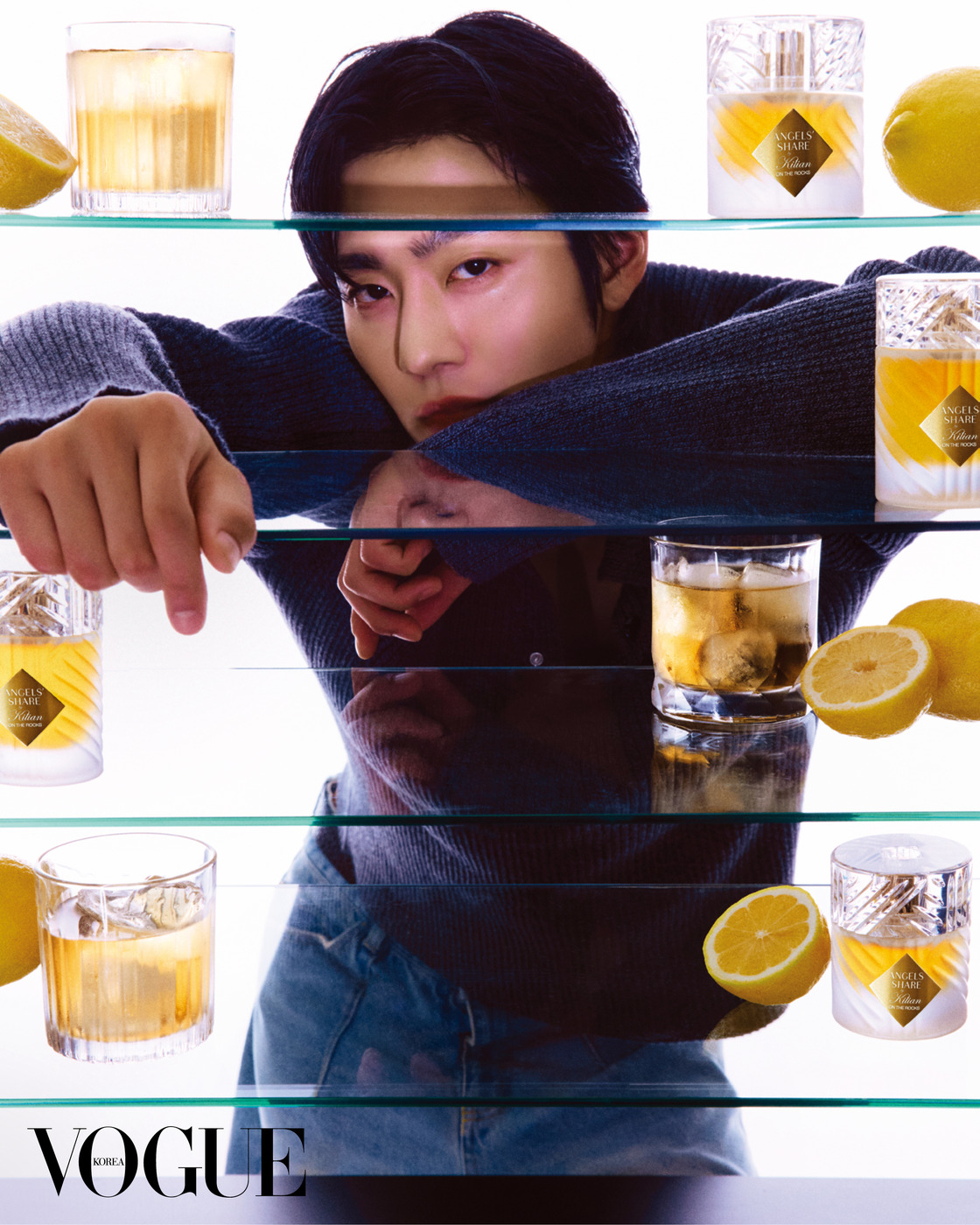 ANGEL’S SHARE 말 그대로 풀어보면 ‘천사들의 몫’이다. 오크통에서 숙성하는 과정에서 술이 조금씩 사라지는데, 이를 의미하는 위스키 용어다. 안효섭은 킬리안 파리 ‘엔젤스 셰어 온더록스’로 술과 천사의 상관관계에 매혹되었다. 의상은 아미리(Amiri).