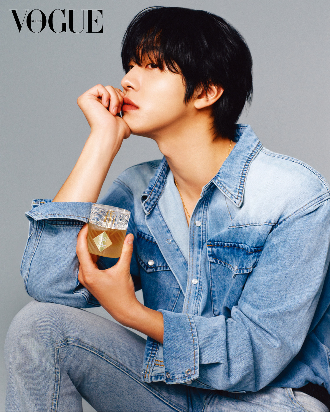 COGNAC CORE 불안정한 세계 속에서 모든 소비자는 세대를 불문하고 신비주의를 찾게 된다. 마음 둘 곳이 필요하니까. 누군가 킬리안 헤네시가 만드는 향수는 한 잔의 술과 같다고 말한다. 분무식으로 선보이는 중독의 기술. 킬리안 파리 ‘엔젤스 셰어 온더록스’의 존재 이유다. 데님 팬츠는 캠퍼우드(Camphor Wood).
