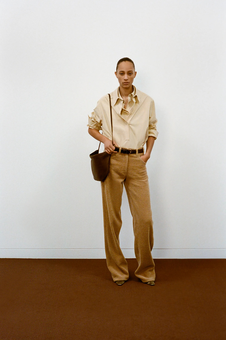 어쩌면 스타일링보다는 ‘발상의 전환’이라는 표현이 더 어울릴지도 모릅니다. 더블 셔츠 스타일링이란 단순하게 셔츠 두 벌을 겹쳐 입는 걸 의미하거든요. 더 로우의 2025 가을/겨울 컬렉션 룩을 보면 더 직관적으로 이해할 수 있습니다. 컬러가 같은 셔츠 두 벌을 껴입은 뒤 무심하게 소매를 접어 올렸을 뿐인데, 익숙한 듯 낯선 레이어드 룩이 완성됐죠. 톱과 팬츠는 물론, 액세서리 색깔까지 전부 갈색 계열로 통일한 것도 주효했습니다.