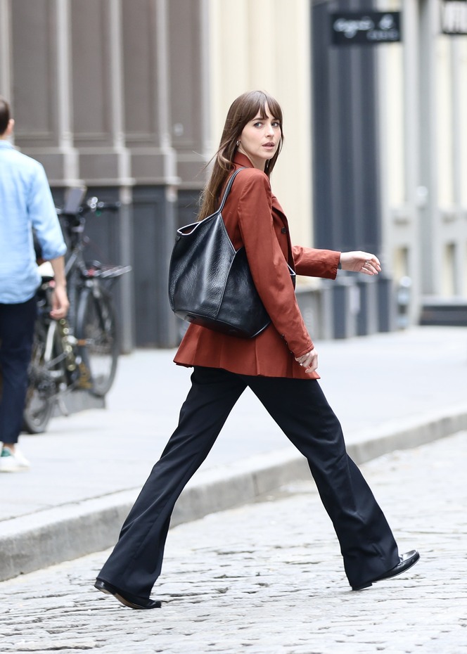 물론 로퍼 위에 입을 수트 팬츠의 핏이 꼭 타이트해야 하는 것은 아닙니다. 캐주얼하고 여유로운 분위기를 풍기는 와이드 팬츠 역시 훌륭한 대안이죠. 다만 이때는 자그마한 디테일에 유의해야 합니다. 드레시한 셔츠나 블레이저는 금물이죠. 팬츠와 마찬가지로, 오버사이즈로 선택하는 편이 좋습니다. 다코타 존슨 역시 지나치게 차려입은 듯한 인상을 주지 않기 위해 홀스빗이 아닌 페니 로퍼를 신었습니다.